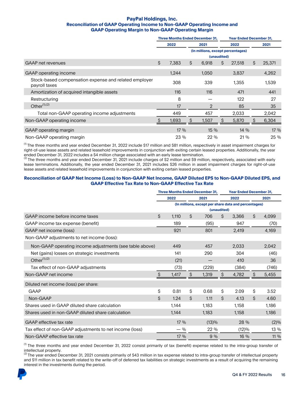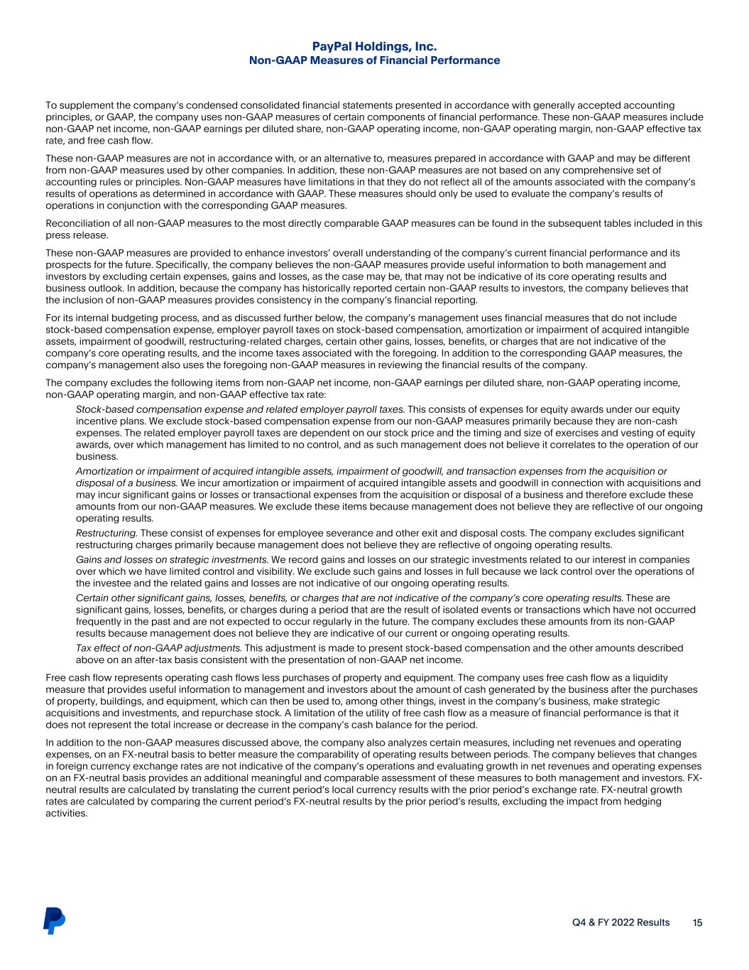 Q4 & FY 2022 Results 15 PayPal Holdings, Inc. Non-GAAP Measures of Financial Performance To supplement the company’s condensed consolidated financial statements presented in accordance with generally accepted accounting principles, or GAAP, the company uses non-GAAP measures of certain components of financial performance. These non-GAAP measures include non-GAAP net income, non-GAAP earnings per diluted share, non-GAAP operating income, non-GAAP operating margin, non-GAAP effective tax rate, and free cash flow. These non-GAAP measures are not in accordance with, or an alternative to, measures prepared in accordance with GAAP and may be different from non-GAAP measures used by other companies. In addition, these non-GAAP measures are not based on any comprehensive set of accounting rules or principles. Non-GAAP measures have limitations in that they do not reflect all of the amounts associated with the company’s results of operations as determined in accordance with GAAP. These measures should only be used to evaluate the company’s results of operations in conjunction with the corresponding GAAP measures. Reconciliation of all non-GAAP measures to the most directly comparable GAAP measures can be found in the subsequent tables included in this press release. These non-GAAP measures are provided to enhance investors’ overall understanding of the company’s current financial performance and its prospects for the future. Specifically, the company believes the non-GAAP measures provide useful information to both management and investors by excluding certain expenses, gains and losses, as the case may be, that may not be indicative of its core operating results and business outlook. In addition, because the company has historically reported certain non-GAAP results to investors, the company believes that the inclusion of non-GAAP measures provides consistency in the company’s financial reporting. For its internal budgeting process, and as discussed further below, the company’s management uses financial measures that do not include stock-based compensation expense, employer payroll taxes on stock-based compensation, amortization or impairment of acquired intangible assets, impairment of goodwill, restructuring-related charges, certain other gains, losses, benefits, or charges that are not indicative of the company’s core operating results, and the income taxes associated with the foregoing. In addition to the corresponding GAAP measures, the company’s management also uses the foregoing non-GAAP measures in reviewing the financial results of the company. The company excludes the following items from non-GAAP net income, non-GAAP earnings per diluted share, non-GAAP operating income, non-GAAP operating margin, and non-GAAP effective tax rate: Stock-based compensation expense and related employer payroll taxes. This consists of expenses for equity awards under our equity incentive plans. We exclude stock-based compensation expense from our non-GAAP measures primarily because they are non-cash expenses. The related employer payroll taxes are dependent on our stock price and the timing and size of exercises and vesting of equity awards, over which management has limited to no control, and as such management does not believe it correlates to the operation of our business. Amortization or impairment of acquired intangible assets, impairment of goodwill, and transaction expenses from the acquisition or disposal of a business. We incur amortization or impairment of acquired intangible assets and goodwill in connection with acquisitions and may incur significant gains or losses or transactional expenses from the acquisition or disposal of a business and therefore exclude these amounts from our non-GAAP measures. We exclude these items because management does not believe they are reflective of our ongoing operating results. Restructuring. These consist of expenses for employee severance and other exit and disposal costs. The company excludes significant restructuring charges primarily because management does not believe they are reflective of ongoing operating results. Gains and losses on strategic investments. We record gains and losses on our strategic investments related to our interest in companies over which we have limited control and visibility. We exclude such gains and losses in full because we lack control over the operations of the investee and the related gains and losses are not indicative of our ongoing operating results. Certain other significant gains, losses, benefits, or charges that are not indicative of the company’s core operating results. These are significant gains, losses, benefits, or charges during a period that are the result of isolated events or transactions which have not occurred frequently in the past and are not expected to occur regularly in the future. The company excludes these amounts from its non-GAAP results because management does not believe they are indicative of our current or ongoing operating results. Tax effect of non-GAAP adjustments. This adjustment is made to present stock-based compensation and the other amounts described above on an after-tax basis consistent with the presentation of non-GAAP net income. Free cash flow represents operating cash flows less purchases of property and equipment. The company uses free cash flow as a liquidity measure that provides useful information to management and investors about the amount of cash generated by the business after the purchases of property, buildings, and equipment, which can then be used to, among other things, invest in the company’s business, make strategic acquisitions and investments, and repurchase stock. A limitation of the utility of free cash flow as a measure of financial performance is that it does not represent the total increase or decrease in the company’s cash balance for the period.   In addition to the non-GAAP measures discussed above, the company also analyzes c