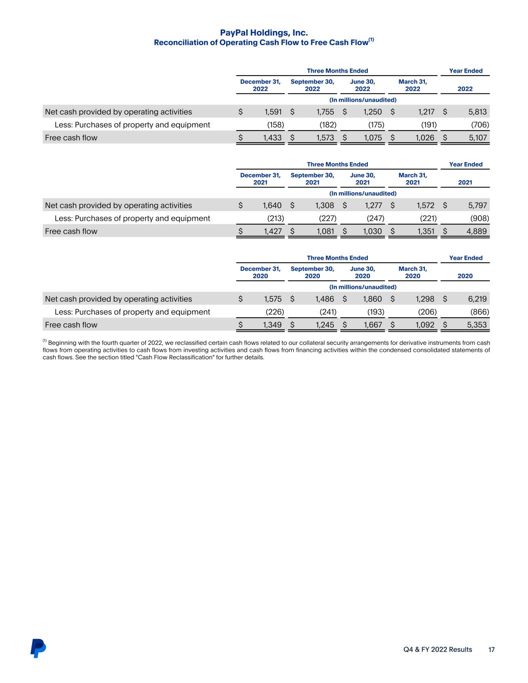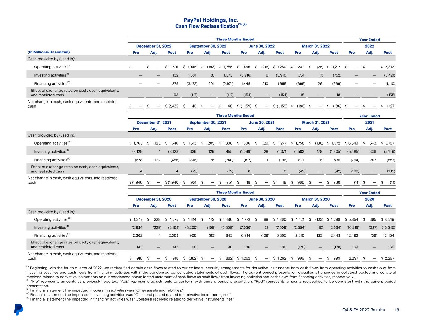 Q4 & FY 2022 Results 17 PayPal Holdings, Inc. Reconciliation of Operating Cash Flow to Free Cash Flow(1) (1) Beginning with the fourth quarter of 2022, we reclassified certain cash flows related to our collateral security arrangements for derivative instruments from cash flows from operating activities to cash flows from investing activities and cash flows from financing activities within the condensed consolidated statements of cash flows. See the section titled "Cash Flow Reclassification" for further details. Three Months Ended Year Ended December 31, 2022 September 30, 2022 June 30, 2022 March 31, 2022 2022 (In millions/unaudited) Net cash provided by operating activities $ 1,591 $ 1,755 $ 1,250 $ 1,217 $ 5,813 Less: Purchases of property and equipment (158) (182) (175) (191) (706) Free cash flow $ 1,433 $ 1,573 $ 1,075 $ 1,026 $ 5,107 Three Months Ended Year Ended December 31, 2021 September 30, 2021 June 30, 2021 March 31, 2021 2021 (In millions/unaudited) Net cash provided by operating activities $ 1,640 $ 1,308 $ 1,277 $ 1,572 $ 5,797 Less: Purchases of property and equipment (213) (227) (247) (221) (908) Free cash flow $ 1,427 $ 1,081 $ 1,030 $ 1,351 $ 4,889 Three Months Ended Year Ended December 31, 2020 September 30, 2020 June 30, 2020 March 31, 2020 2020 (In millions/unaudited) Net cash provided by operating activities $ 1,575 $ 1,486 $ 1,860 $ 1,298 $ 6,219 Less: Purchases of property and equipment (226) (241) (193) (206) (866) Free cash flow $ 1,349 $ 1,245 $ 1,667 $ 1,092 $ 5,353