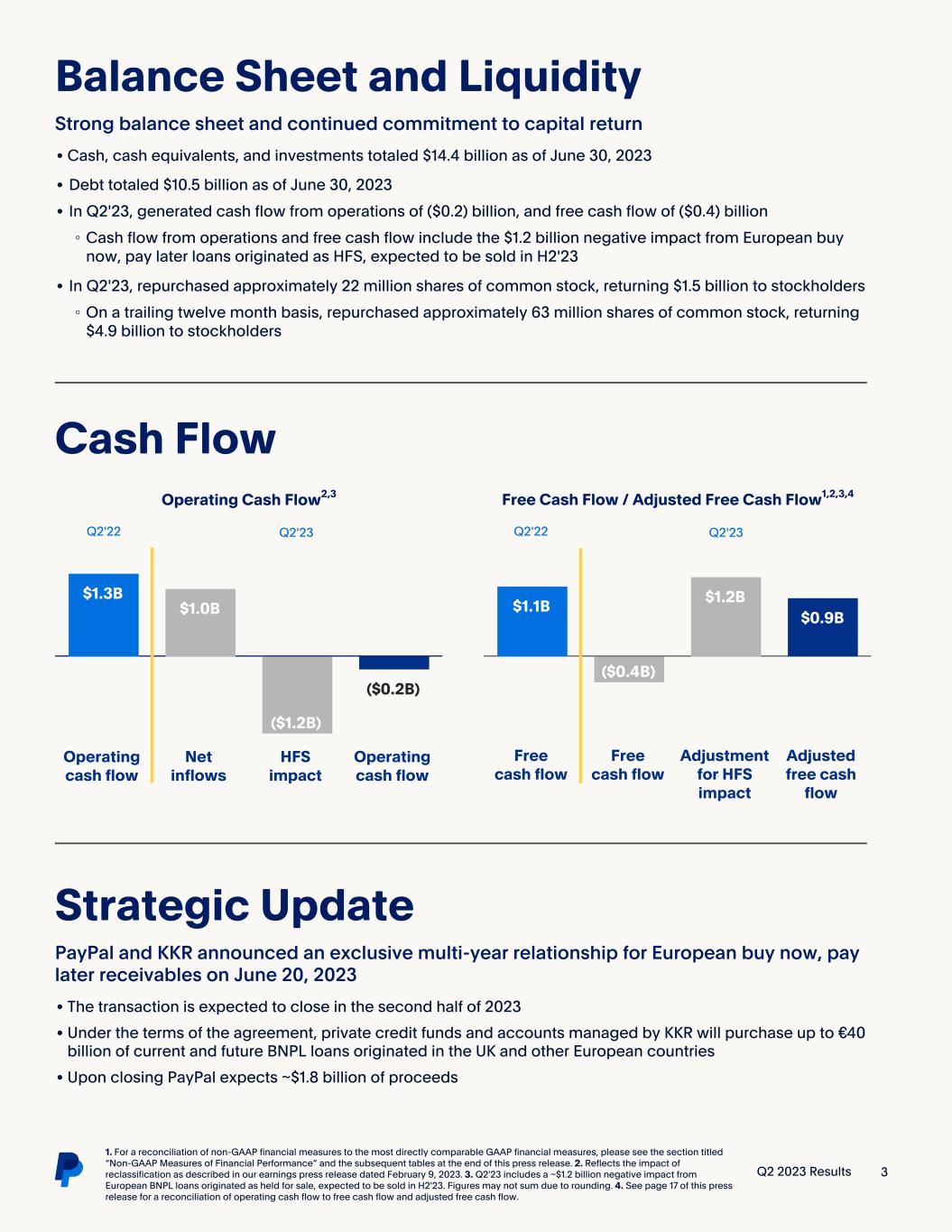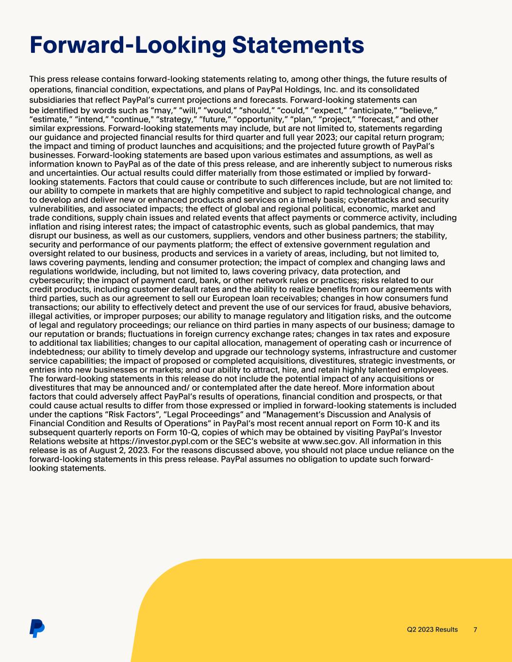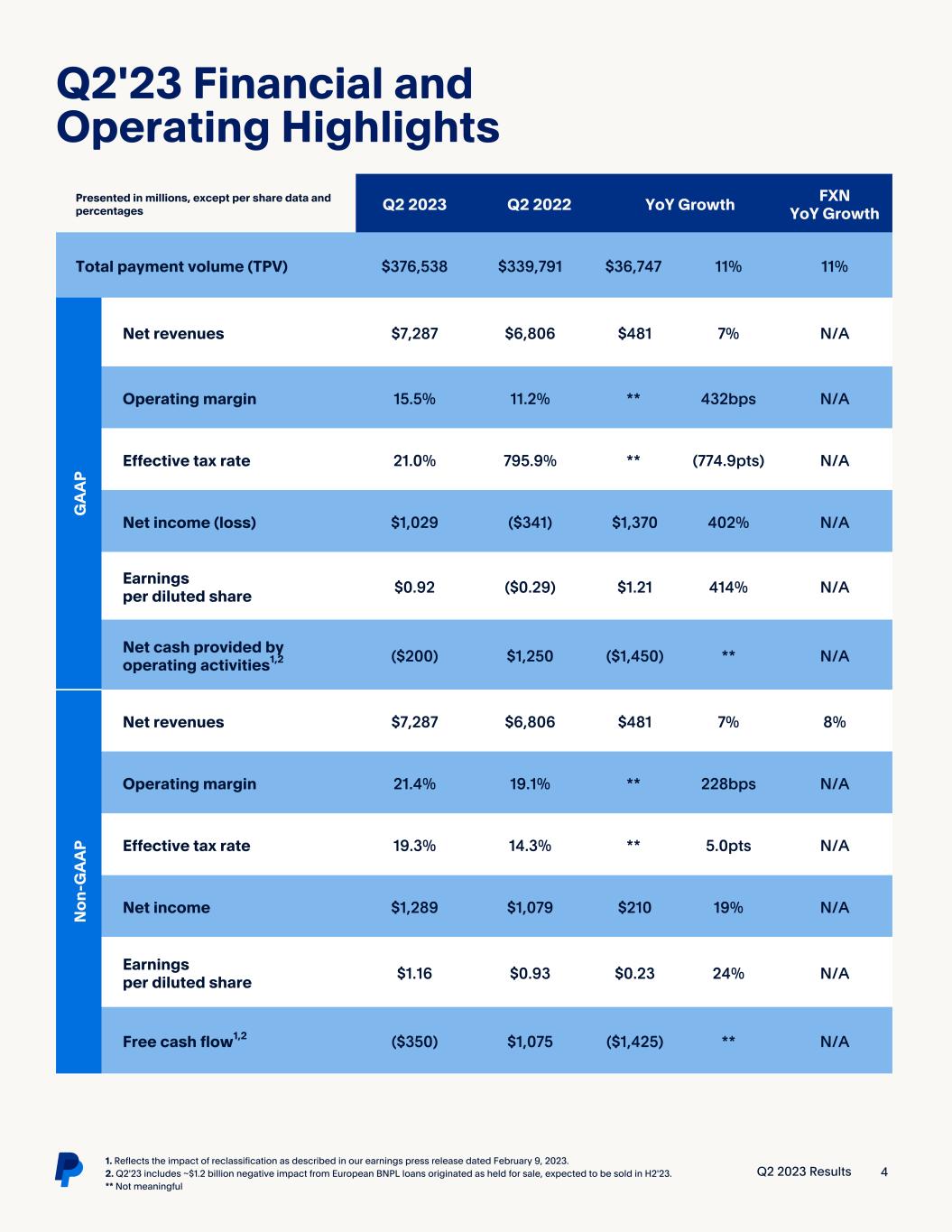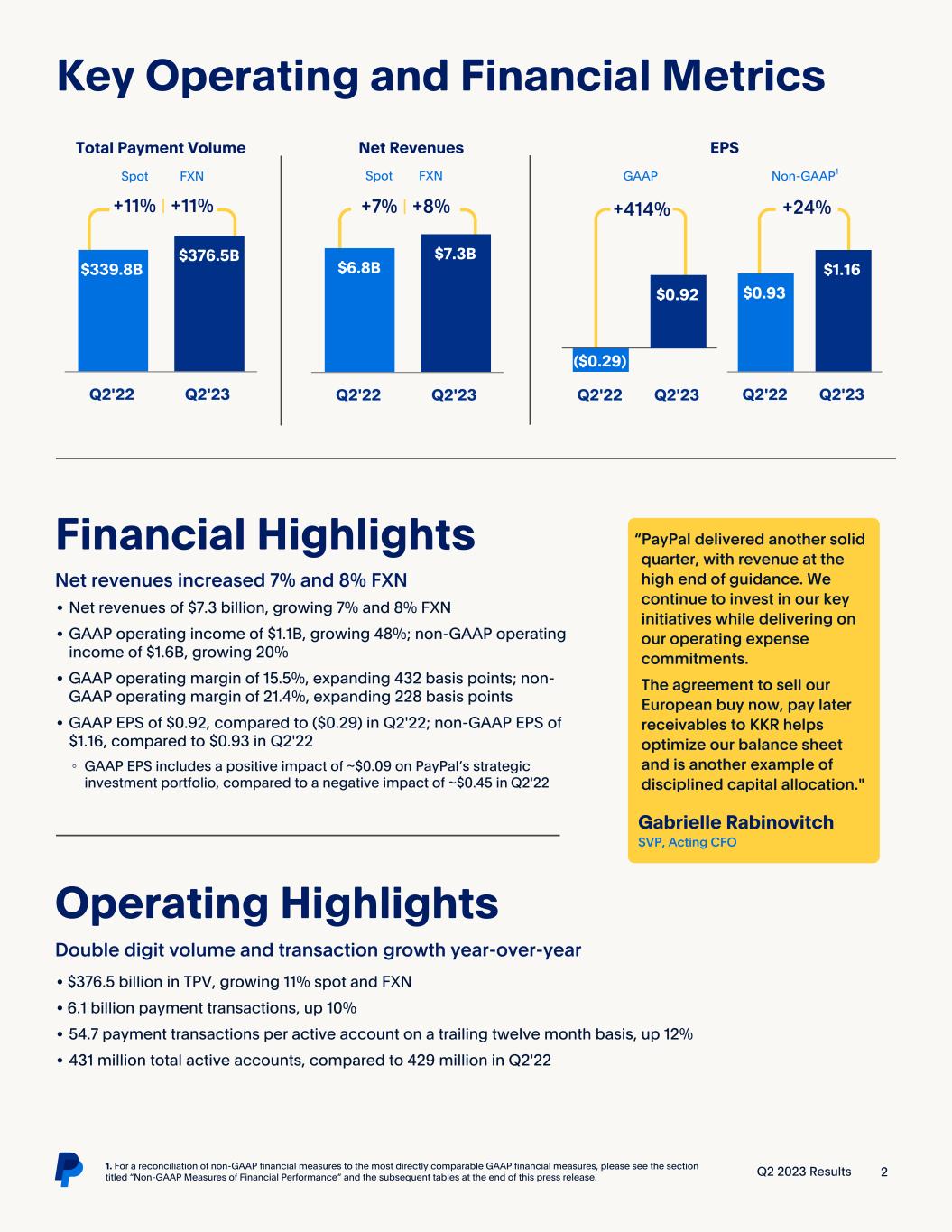 (NASDAQ: PYPL) Q2 2023 Results 1 Q2'23 Highlights For a reconciliation of non-GAAP financial measures to the most directly comparable GAAP financial measures, please see the section titled “Non-GAAP Measures of Financial Performance” and the subsequent tables at the end of this press release. 1. On an FXN basis. Q2'23: Solid performance with revenue at the high end of guidance • Total payment volume (TPV) of $376.5 billion, growing 11% on a spot and FX-neutral (FXN) basis • Net revenues of $7.3 billion, growing 7% and 8% FXN • GAAP operating income of $1.1B, growing 48%; non-GAAP operating income of $1.6B, growing 20% • GAAP EPS of $0.92 compared to ($0.29) in Q2'22; non-GAAP EPS of $1.16 compared to $0.93 in Q2'22, growing 24% • Operating cash flow of ($0.2) billion and free cash flow of ($0.4) billion, which include a ~$1.2 billion negative impact from European buy now, pay later (BNPL) loans originated as held for sale (HFS), expected to be sold in H2'23 FY'23: Ongoing operating discipline and execution drive earnings growth • Q3'23 net revenues expected to grow ~8% on a spot and FXN basis to ~$7.4B • Q3'23 GAAP EPS expected to be $0.85-$0.87; non-GAAP EPS expected to grow 13%-14% to $1.22-$1.24 • FY'23 GAAP EPS expected to be ~$3.49 compared to $2.09 in FY'22; reiterating non-GAAP EPS, expected to grow ~20% to ~$4.95 • FY'23 share repurchases now expected to reach ~$5 billion Second Quarter 2023 Results San Jose, California  August 2, 2023 Dan Schulman President and CEO GAAP Non-GAAP USD $ YoY Change USD $ YoY Change Net Revenues $7.3B 7% $7.3B 8%1 Operating Income $1.1B 48% $1.6B 20% EPS $0.92 414% $1.16 24% “Our second quarter results show continued momentum. We have high confidence that our business is on the right path and we're seeing clear signs that the investments we've made are paying off. Our teams are energized, and I'm confident that we're well positioned to continue to grow our leadership in digital payments."