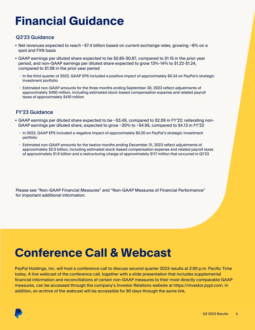 Q2 2023 Results 5 Financial Guidance Q3'23 Guidance • Net revenues expected to reach ~$7.4 billion based on current exchange rates, growing ~8% on a spot and FXN basis • GAAP earnings per diluted share expected to be $0.85-$0.87, compared to $1.15 in the prior year period, and non-GAAP earnings per diluted share expected to grow 13%-14% to $1.22-$1.24, compared to $1.08 in the prior year period ◦ In the third quarter of 2022, GAAP EPS included a positive impact of approximately $0.34 on PayPal’s strategic investment portfolio ◦ Estimated non-GAAP amounts for the three months ending September 30, 2023 reflect adjustments of approximately $490 million, including estimated stock-based compensation expense and related payroll taxes of approximately $410 million FY'23 Guidance • GAAP earnings per diluted share expected to be ~$3.49, compared to $2.09 in FY’22; reiterating non- GAAP earnings per diluted share, expected to grow ~20% to ~$4.95, compared to $4.13 in FY’22 ◦ In 2022, GAAP EPS included a negative impact of approximately $0.20 on PayPal’s strategic investment portfolio ◦ Estimated non-GAAP amounts for the twelve months ending December 31, 2023 reflect adjustments of approximately $2.0 billion, including estimated stock-based compensation expense and related payroll taxes of approximately $1.6 billion and a restructuring charge of approximately $117 million that occurred in Q1'23 Conference Call & Webcast PayPal Holdings, Inc. will host a conference call to discuss second quarter 2023 results at 2:00 p.m. Pacific Time today. A live webcast of the conference call, together with a slide presentation that includes supplemental financial information and reconciliations of certain non-GAAP measures to their most directly comparable GAAP measures, can be accessed through the company’s Investor Relations website at https://investor.pypl.com. In addition, an archive of the webcast will be accessible for 90 days through the same link. Please see “Non-GAAP Financial Measures” and “Non-GAAP Measures of Financial Performance” for important additional information.