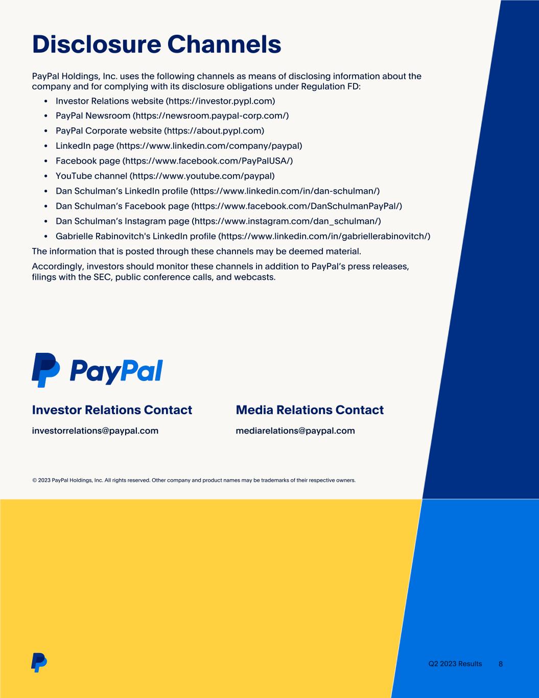 Q2 2023 Results 8 Disclosure Channels PayPal Holdings, Inc. uses the following channels as means of disclosing information about the company and for complying with its disclosure obligations under Regulation FD: • Investor Relations website (https://investor.pypl.com) • PayPal Newsroom (https://newsroom.paypal-corp.com/) • PayPal Corporate website (https://about.pypl.com) • LinkedIn page (https://www.linkedin.com/company/paypal) • Facebook page (https://www.facebook.com/PayPalUSA/) • YouTube channel (https://www.youtube.com/paypal) • Dan Schulman’s LinkedIn profile (https://www.linkedin.com/in/dan-schulman/) • Dan Schulman’s Facebook page (https://www.facebook.com/DanSchulmanPayPal/) • Dan Schulman’s Instagram page (https://www.instagram.com/dan_schulman/) • Gabrielle Rabinovitch's LinkedIn profile (https://www.linkedin.com/in/gabriellerabinovitch/) The information that is posted through these channels may be deemed material. Accordingly, investors should monitor these channels in addition to PayPal’s press releases, filings with the SEC, public conference calls, and webcasts. Investor Relations Contact investorrelations@paypal.com Media Relations Contact mediarelations@paypal.com © 2023 PayPal Holdings, Inc. All rights reserved. Other company and product names may be trademarks of their respective owners.