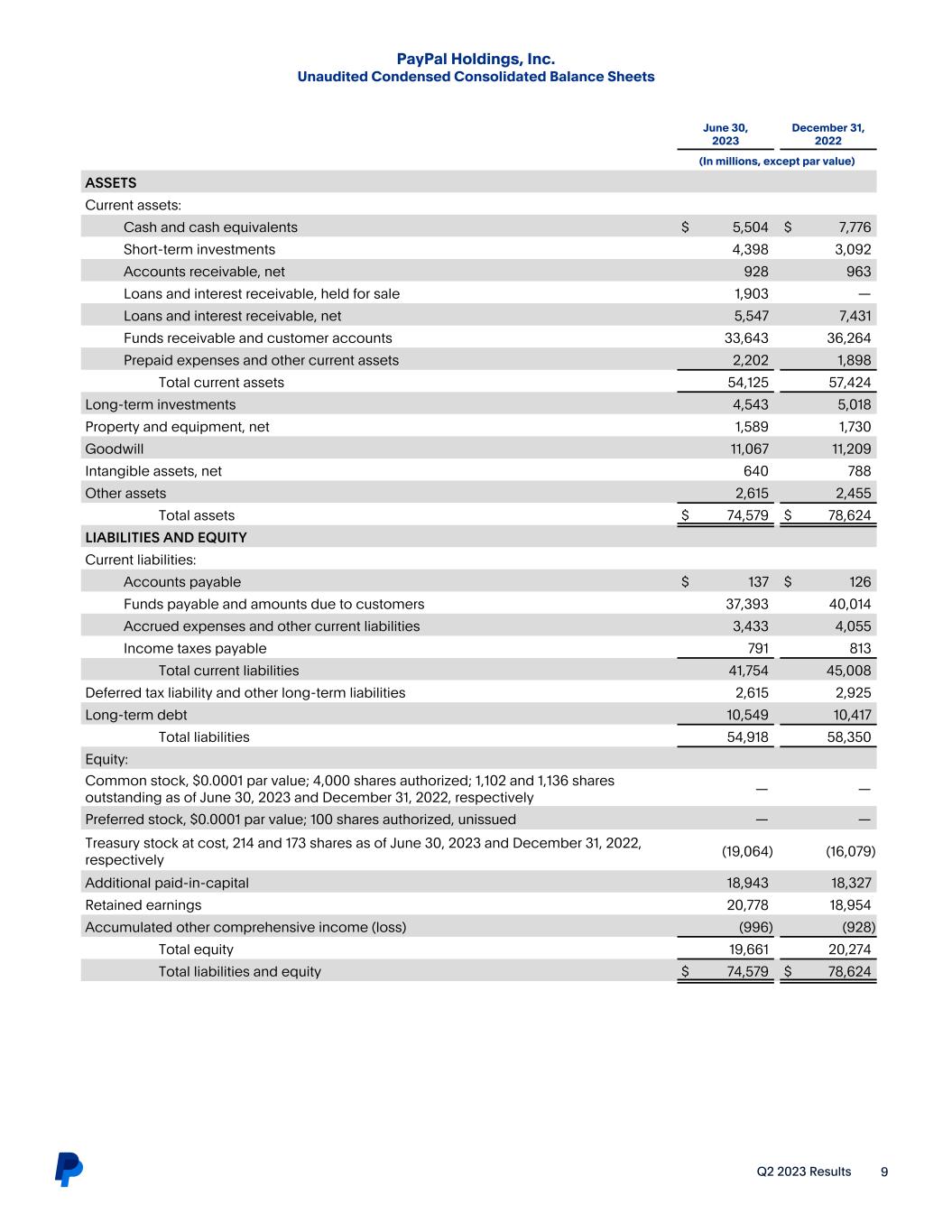 Q2 2023 Results 9 PayPal Holdings, Inc. Unaudited Condensed Consolidated Balance Sheets June 30, 2023 December 31, 2022 (In millions, except par value) ASSETS Current assets:     Cash and cash equivalents $ 5,504 $ 7,776 Short-term investments 4,398 3,092 Accounts receivable, net 928 963 Loans and interest receivable, held for sale 1,903 — Loans and interest receivable, net 5,547 7,431 Funds receivable and customer accounts 33,643 36,264 Prepaid expenses and other current assets 2,202 1,898 Total current assets 54,125 57,424 Long-term investments 4,543 5,018 Property and equipment, net 1,589 1,730 Goodwill 11,067 11,209 Intangible assets, net 640 788 Other assets 2,615 2,455 Total assets $ 74,579 $ 78,624 LIABILITIES AND EQUITY Current liabilities: Accounts payable $ 137 $ 126 Funds payable and amounts due to customers 37,393 40,014 Accrued expenses and other current liabilities 3,433 4,055 Income taxes payable 791 813 Total current liabilities 41,754 45,008 Deferred tax liability and other long-term liabilities 2,615 2,925 Long-term debt 10,549 10,417 Total liabilities 54,918 58,350 Equity: Common stock, $0.0001 par value; 4,000 shares authorized; 1,102 and 1,136 shares outstanding as of June 30, 2023 and December 31, 2022, respectively — — Preferred stock, $0.0001 par value; 100 shares authorized, unissued — — Treasury stock at cost, 214 and 173 shares as of June 30, 2023 and December 31, 2022, respectively (19,064) (16,079) Additional paid-in-capital 18,943 18,327 Retained earnings 20,778 18,954 Accumulated other comprehensive income (loss) (996) (928) Total equity 19,661 20,274 Total liabilities and equity $ 74,579 $ 78,624