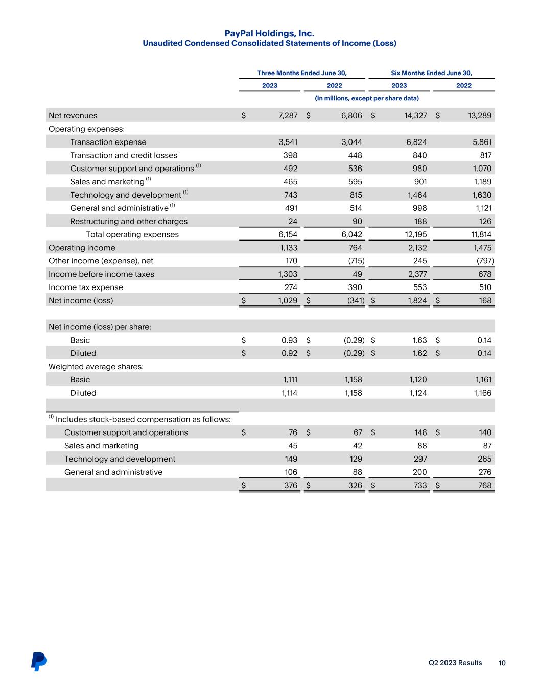 Q2 2023 Results 10 PayPal Holdings, Inc. Unaudited Condensed Consolidated Statements of Income (Loss)   Three Months Ended June 30, Six Months Ended June 30,   2023 2022 2023 2022   (In millions, except per share data) Net revenues $ 7,287 $ 6,806 $ 14,327 $ 13,289 Operating expenses: Transaction expense 3,541 3,044 6,824 5,861 Transaction and credit losses 398 448 840 817 Customer support and operations (1) 492 536 980 1,070 Sales and marketing (1) 465 595 901 1,189 Technology and development (1) 743 815 1,464 1,630 General and administrative (1) 491 514 998 1,121 Restructuring and other charges 24 90 188 126 Total operating expenses 6,154 6,042 12,195 11,814 Operating income 1,133 764 2,132 1,475 Other income (expense), net 170 (715) 245 (797) Income before income taxes 1,303 49 2,377 678 Income tax expense 274 390 553 510 Net income (loss) $ 1,029 $ (341) $ 1,824 $ 168 Net income (loss) per share: Basic $ 0.93 $ (0.29) $ 1.63 $ 0.14 Diluted $ 0.92 $ (0.29) $ 1.62 $ 0.14 Weighted average shares: Basic 1,111 1,158 1,120 1,161 Diluted 1,114 1,158 1,124 1,166 (1) Includes stock-based compensation as follows: Customer support and operations $ 76 $ 67 $ 148 $ 140 Sales and marketing 45 42 88 87 Technology and development 149 129 297 265 General and administrative 106 88 200 276 $ 376 $ 326 $ 733 $ 768