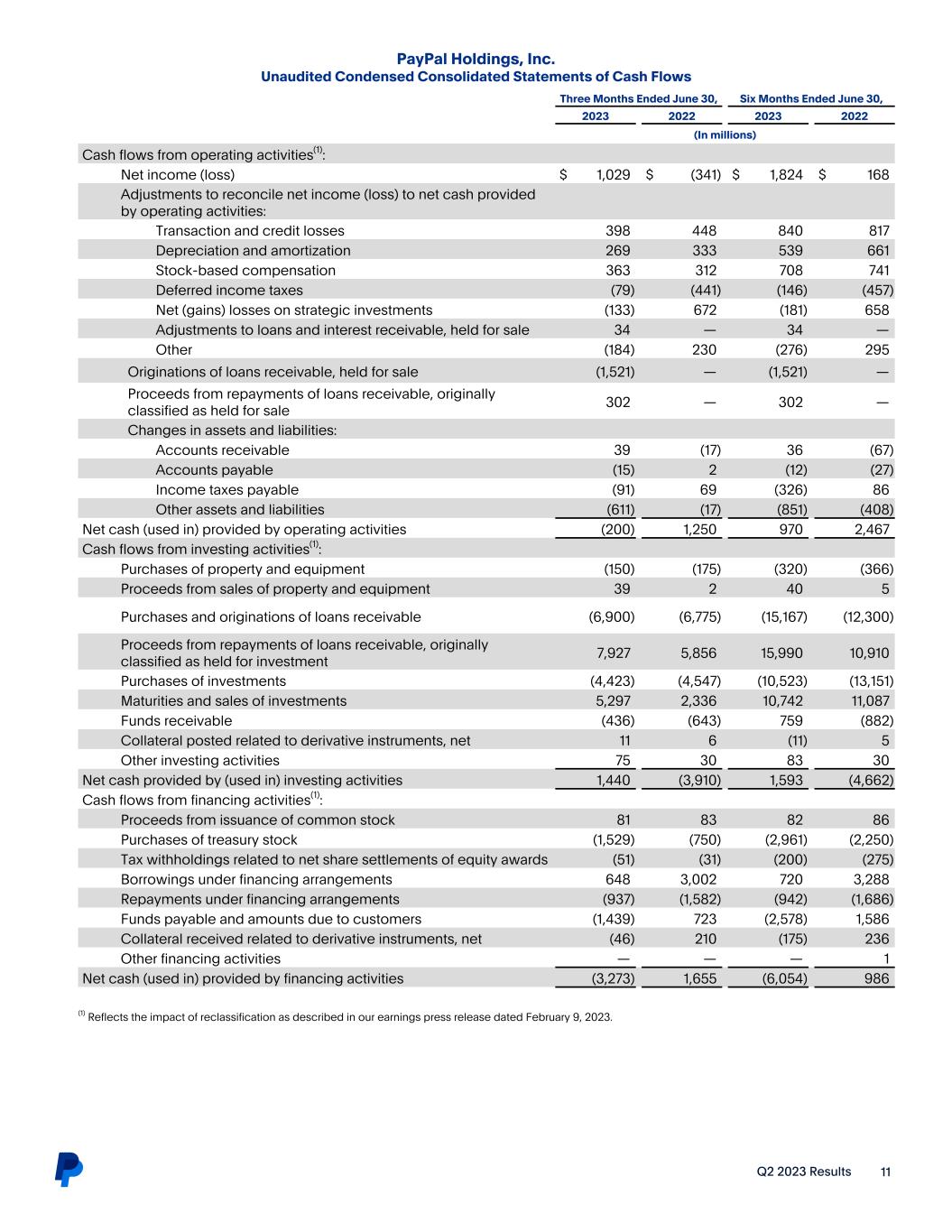 Q2 2023 Results 11 PayPal Holdings, Inc. Unaudited Condensed Consolidated Statements of Cash Flows Three Months Ended June 30, Six Months Ended June 30, 2023 2022 2023 2022 (In millions) Cash flows from operating activities(1): Net income (loss) $ 1,029 $ (341) $ 1,824 $ 168 Adjustments to reconcile net income (loss) to net cash provided by operating activities: Transaction and credit losses 398 448 840 817 Depreciation and amortization 269 333 539 661 Stock-based compensation 363 312 708 741 Deferred income taxes (79) (441) (146) (457) Net (gains) losses on strategic investments (133) 672 (181) 658 Adjustments to loans and interest receivable, held for sale 34 — 34 — Other (184) 230 (276) 295 Originations of loans receivable, held for sale (1,521) — (1,521) — Proceeds from repayments of loans receivable, originally classified as held for sale 302 — 302 — Changes in assets and liabilities: Accounts receivable 39 (17) 36 (67) Accounts payable (15) 2 (12) (27) Income taxes payable (91) 69 (326) 86 Other assets and liabilities (611) (17) (851) (408) Net cash (used in) provided by operating activities (200) 1,250 970 2,467 Cash flows from investing activities(1): Purchases of property and equipment (150) (175) (320) (366) Proceeds from sales of property and equipment 39 2 40 5 Purchases and originations of loans receivable (6,900) (6,775) (15,167) (12,300) Proceeds from repayments of loans receivable, originally classified as held for investment 7,927 5,856 15,990 10,910 Purchases of investments (4,423) (4,547) (10,523) (13,151) Maturities and sales of investments 5,297 2,336 10,742 11,087 Funds receivable (436) (643) 759 (882) Collateral posted related to derivative instruments, net 11 6 (11) 5 Other investing activities 75 30 83 30 Net cash provided by (used in) investing activities 1,440 (3,910) 1,593 (4,662) Cash flows from financing activities(1): Proceeds from issuance of common stock 81 83 82 86 Purchases of treasury stock (1,529) (750) (2,961) (2,250) Tax withholdings related to net share settlements of equity awards (51) (31) (200) (275) Borrowings under financing arrangements 648 3,002 720 3,288 Repayments under financing arrangements (937) (1,582) (942) (1,686) Funds payable and amounts due to customers (1,439) 723 (2,578) 1,586 Collateral received related to derivative instruments, net (46) 210 (175) 236 Other financing activities — — — 1 Net cash (used in) provided by financing activities (3,273) 1,655 (6,054) 986 (1) Reflects the impact of reclassification as described in our earnings press release dated February 9, 2023.