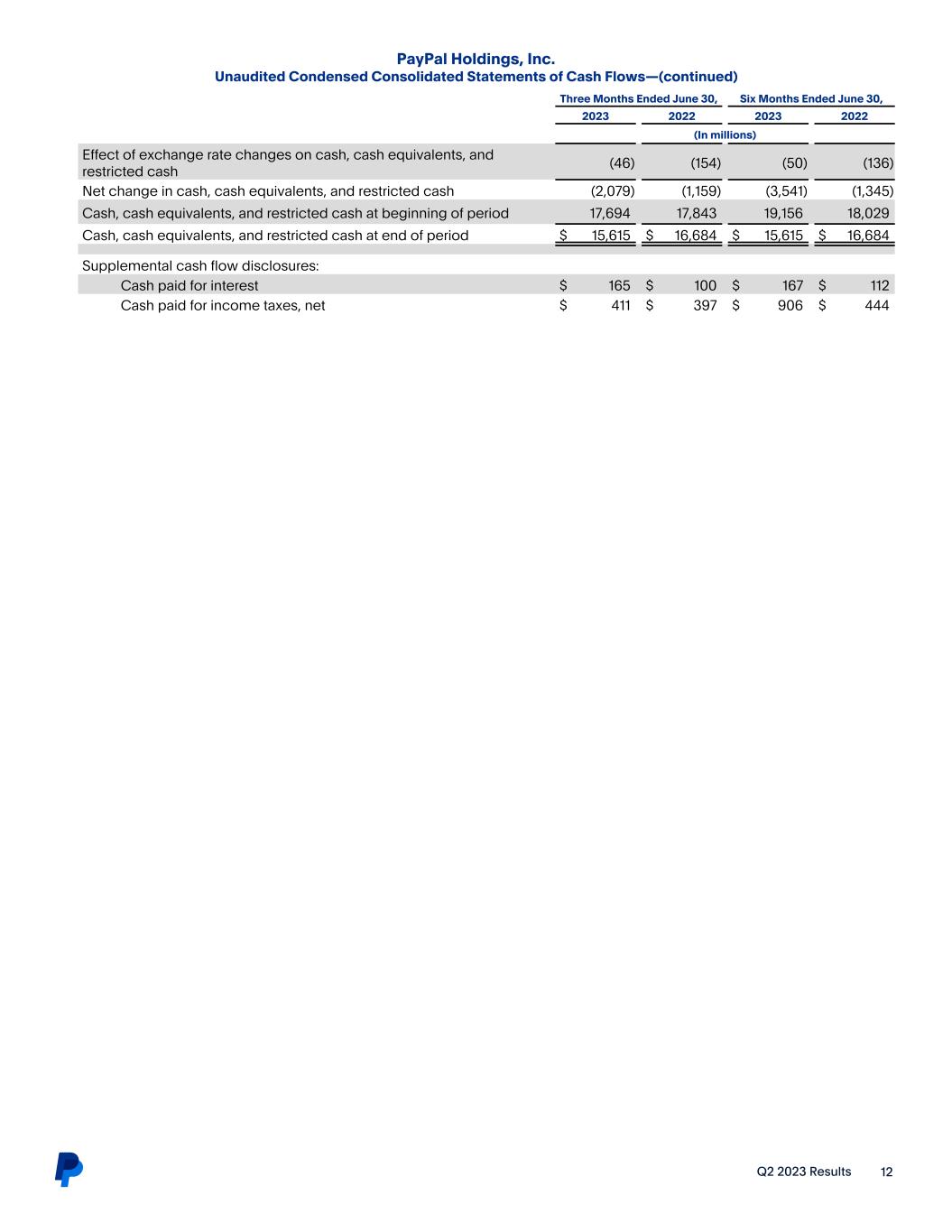 Q2 2023 Results 12 PayPal Holdings, Inc. Unaudited Condensed Consolidated Statements of Cash Flows—(continued) Three Months Ended June 30, Six Months Ended June 30, 2023 2022 2023 2022 (In millions) Effect of exchange rate changes on cash, cash equivalents, and restricted cash (46) (154) (50) (136) Net change in cash, cash equivalents, and restricted cash (2,079) (1,159) (3,541) (1,345) Cash, cash equivalents, and restricted cash at beginning of period 17,694 17,843 19,156 18,029 Cash, cash equivalents, and restricted cash at end of period $ 15,615 $ 16,684 $ 15,615 $ 16,684 Supplemental cash flow disclosures: Cash paid for interest $ 165 $ 100 $ 167 $ 112 Cash paid for income taxes, net $ 411 $ 397 $ 906 $ 444