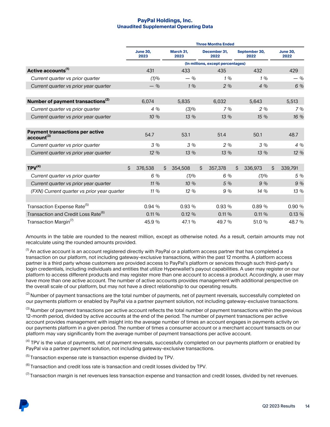 Q2 2023 Results 14 PayPal Holdings, Inc. Unaudited Supplemental Operating Data Three Months Ended June 30, 2023 March 31, 2023 December 31, 2022 September 30, 2022 June 30, 2022 (In millions, except percentages) Active accounts(1) 431 433 435 432 429 Current quarter vs prior quarter (1) % — % 1 % 1 % — % Current quarter vs prior year quarter — % 1 % 2 % 4 % 6 % Number of payment transactions(2) 6,074 5,835 6,032 5,643 5,513 Current quarter vs prior quarter 4 % (3) % 7 % 2 % 7 % Current quarter vs prior year quarter 10 % 13 % 13 % 15 % 16 % Payment transactions per active account(3) 54.7 53.1 51.4 50.1 48.7 Current quarter vs prior quarter 3 % 3 % 2 % 3 % 4 % Current quarter vs prior year quarter 12 % 13 % 13 % 13 % 12 % TPV(4) $ 376,538 $ 354,508 $ 357,378 $ 336,973 $ 339,791 Current quarter vs prior quarter 6 % (1) % 6 % (1) % 5 % Current quarter vs prior year quarter 11 % 10 % 5 % 9 % 9 % (FXN) Current quarter vs prior year quarter 11 % 12 % 9 % 14 % 13 % Transaction Expense Rate(5) 0.94 % 0.93 % 0.93 % 0.89 % 0.90 % Transaction and Credit Loss Rate(6) 0.11 % 0.12 % 0.11 % 0.11 % 0.13 % Transaction Margin(7) 45.9 % 47.1 % 49.7 % 51.0 % 48.7 % Amounts in the table are rounded to the nearest million, except as otherwise noted. As a result, certain amounts may not recalculate using the rounded amounts provided. (1) An active account is an account registered directly with PayPal or a platform access partner that has completed a transaction on our platform, not including gateway-exclusive transactions, within the past 12 months. A platform access partner is a third party whose customers are provided access to PayPal’s platform or services through such third-party’s login credentials, including individuals and entities that utilize Hyperwallet’s payout capabilities. A user may register on our platform to access different products and may register more than one account to access a product. Accordingly, a user may have more than one active account. The number of active accounts provides management with additional perspective on the overall scale of our platform, but may not have a direct relationship to our operating results. (2) Number of payment transactions are the total number of payments, net of payment reversals, successfully completed on our payments platform or enabled by PayPal via a partner payment solution, not including gateway-exclusive transactions. (3) Number of payment transactions per active account reflects the total number of payment transactions within the previous 12-month period, divided by active accounts at the end of the period. The number of payment transactions per active account provides management with insight into the average number of times an account engages in payments activity on our payments platform in a given period. The number of times a consumer account or a merchant account transacts on our platform may vary significantly from the average number of payment transactions per active account. (4) TPV is the value of payments, net of payment reversals, successfully completed on our payments platform or enabled by PayPal via a partner payment solution, not including gateway-exclusive transactions. (5) Transaction expense rate is transaction expense divided by TPV. (6) Transaction and credit loss rate is transaction and credit losses divided by TPV. (7) Transaction margin is net revenues less transaction expense and transaction and credit losses, divided by net revenues.