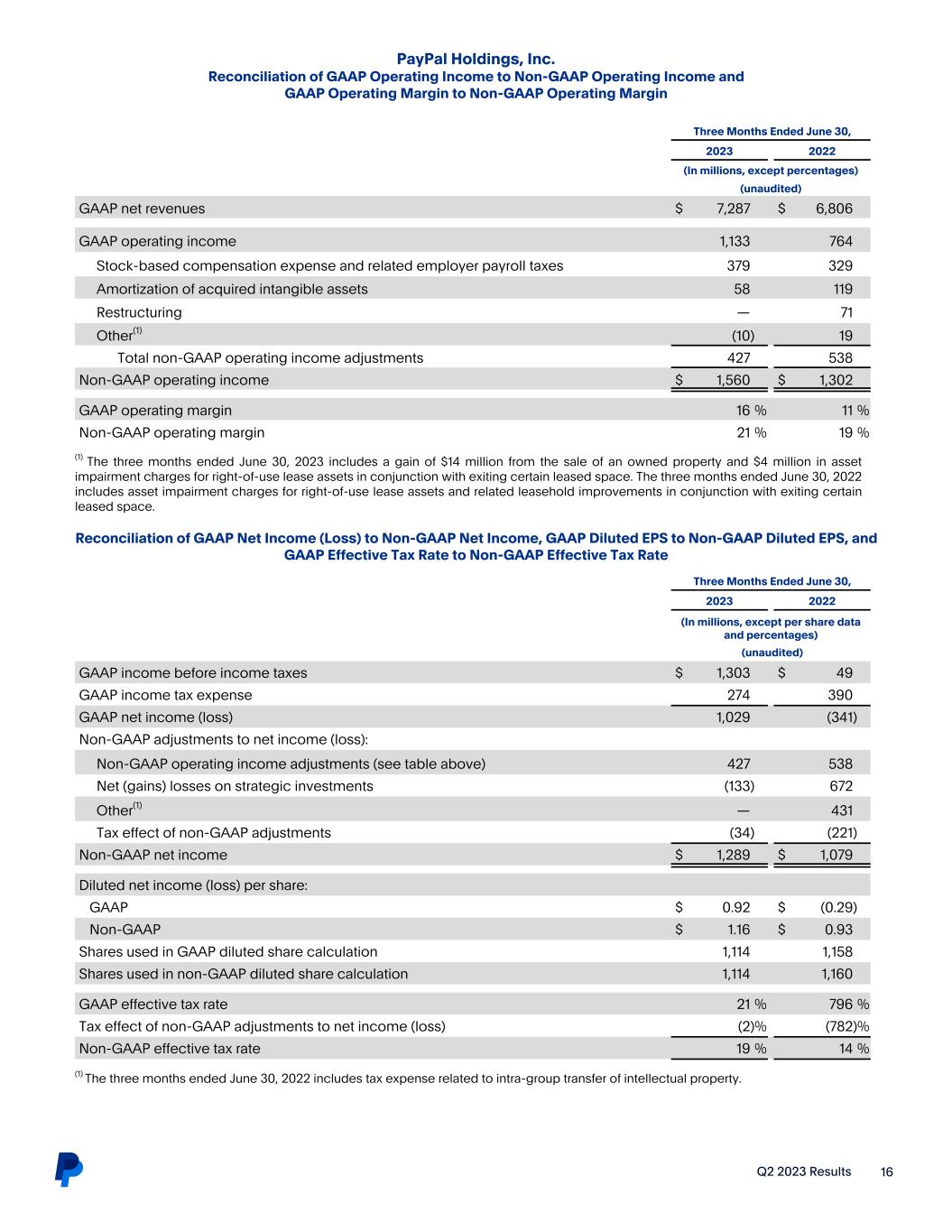 Q2 2023 Results 15 PayPal Holdings, Inc. Non-GAAP Measures of Financial Performance To supplement the company’s condensed consolidated financial statements presented in accordance with generally accepted accounting principles, or GAAP, the company uses non-GAAP measures of certain components of financial performance. These non-GAAP measures include non-GAAP net income, non-GAAP earnings per diluted share, non-GAAP operating income, non-GAAP operating margin, non-GAAP effective tax rate, free cash flow, and adjusted free cash flow. These non-GAAP measures are not in accordance with, or an alternative to, measures prepared in accordance with GAAP and may be different from non-GAAP measures used by other companies. In addition, these non-GAAP measures are not based on any comprehensive set of accounting rules or principles. Non-GAAP measures have limitations in that they do not reflect all of the amounts associated with the company’s results of operations as determined in accordance with GAAP. These measures should only be used to evaluate the company’s results of operations in conjunction with the corresponding GAAP measures. Reconciliation of all non-GAAP measures to the most directly comparable GAAP measures can be found in the subsequent tables included in this press release. These non-GAAP measures are provided to enhance investors’ overall understanding of the company’s current financial performance and its prospects for the future. Specifically, the company believes the non-GAAP measures provide useful information to both management and investors by excluding certain expenses, gains and losses, as the case may be, that may not be indicative of its core operating results and business outlook. In addition, because the company has historically reported certain non-GAAP results to investors, the company believes that the inclusion of non-GAAP measures provides consistency in the company’s financial reporting. For its internal budgeting process, and as discussed further below, the company’s management uses financial measures that do not include stock-based compensation expense, employer payroll taxes on stock-based compensation, amortization or impairment of acquired intangible assets, impairment of goodwill, restructuring-related charges, certain other gains, losses, benefits, or charges that are not indicative of the company’s core operating results, and the income taxes associated with the foregoing. In addition to the corresponding GAAP measures, the company’s management also uses the foregoing non-GAAP measures in reviewing the financial results of the company. The company excludes the following items from non-GAAP net income, non-GAAP earnings per diluted share, non-GAAP operating income, non-GAAP operating margin, and non-GAAP effective tax rate: Stock-based compensation expense and related employer payroll taxes. This consists of expenses for equity awards under our equity incentive plans. We exclude stock-based compensation expense from our non-GAAP measures primarily because they are non-cash expenses. The related employer payroll taxes are dependent on our stock price and the timing and size of exercises and vesting of equity awards, over which management has limited to no control, and as such management does not believe it correlates to the operation of our business. Amortization or impairment of acquired intangible assets, impairment of goodwill, and transaction expenses from the acquisition or disposal of a business. We incur amortization or impairment of acquired intangible assets and goodwill in connection with acquisitions and may incur significant gains or losses or transactional expenses from the acquisition or disposal of a business and therefore exclude these amounts from our non-GAAP measures. We exclude these items because management does not believe they are reflective of our ongoing operating results. Restructuring. These consist of expenses for employee severance and other exit and disposal costs. The company excludes significant restructuring charges primarily because management does not believe they are reflective of ongoing operating results. Gains and losses on strategic investments. The gains and losses we record on our strategic investments are tied to the performance of the companies that we invest in. We exclude such gains and losses in full because the operations of the investee and the related gains and losses are not indicative of our ongoing operating results. Certain other significant gains, losses, benefits, or charges that are not indicative of the company’s core operating results. These are significant gains, losses, benefits, or charges during a period that are the result of isolated events or transactions which have not occurred frequently in the past and are not expected to occur regularly in the future. The company excludes these amounts from its non-GAAP results because management does not believe they are indicative of our current or ongoing operating results. Tax effect of non-GAAP adjustments. This adjustment is made to present stock-based compensation and the other amounts described above on an after-tax basis consistent with the presentation of non-GAAP net income. Free cash flow represents operating cash flows less purchases of property and equipment. The company uses free cash flow as a liquidity measure that provides useful information to management and investors about the amount of cash generated by the business after the purchases of property, buildings, and equipment, which can then be used to, among other things, invest in the company’s business, make strategic acquisitions and investments, and repurchase stock. A limitation of the utility of free cash flow as a measure of financial performance is that it does not represent the total increase or decrease in the company’s cash balance for the period.   In addition to the non-GAAP measures discussed above, the company also analyzes certain measures, incl