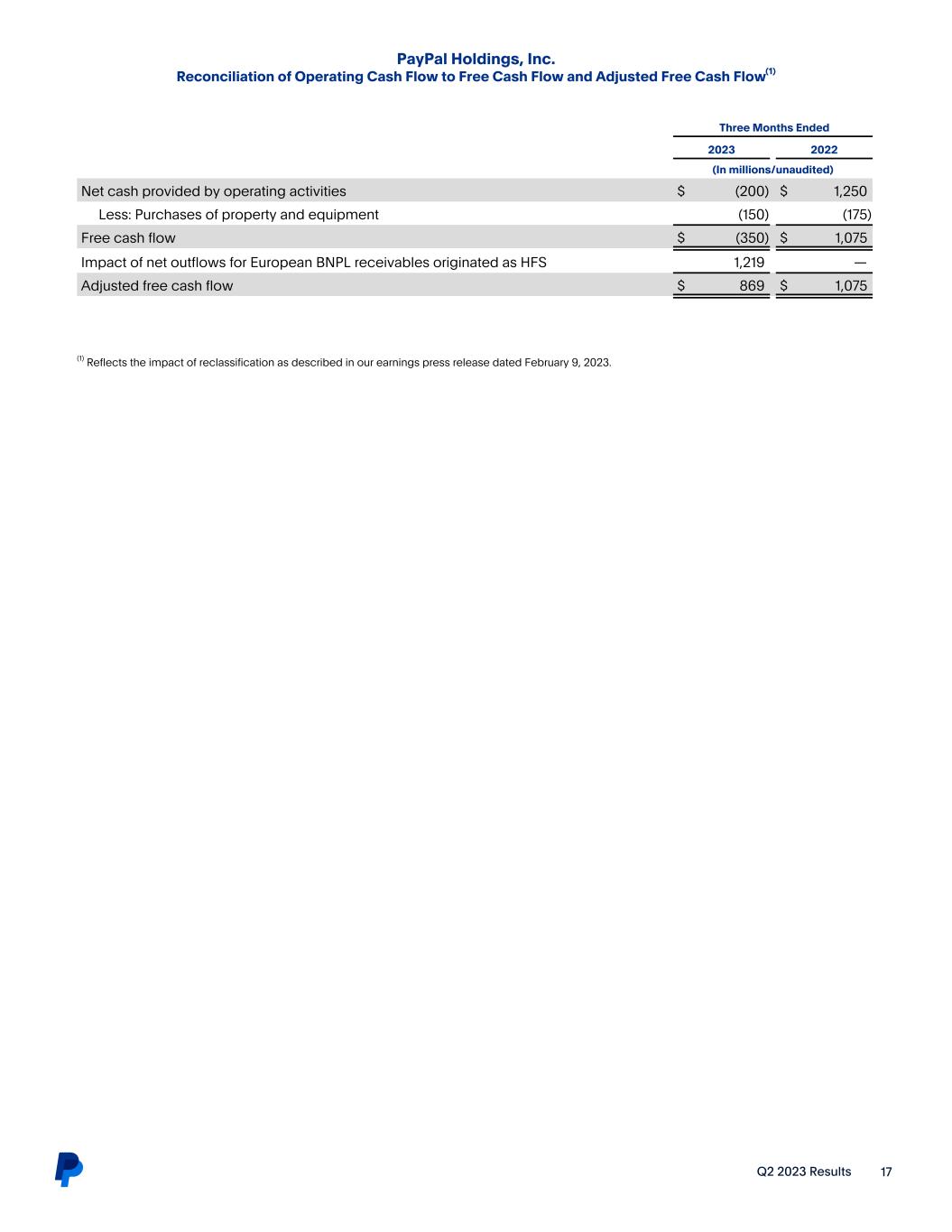 Q2 2023 Results 17 PayPal Holdings, Inc. Reconciliation of Operating Cash Flow to Free Cash Flow and Adjusted Free Cash Flow(1) (1) Reflects the impact of reclassification as described in our earnings press release dated February 9, 2023. Three Months Ended 2023 2022 (In millions/unaudited) Net cash provided by operating activities $ (200) $ 1,250 Less: Purchases of property and equipment (150) (175) Free cash flow $ (350) $ 1,075 Impact of net outflows for European BNPL receivables originated as HFS 1,219 — Adjusted free cash flow $ 869 $ 1,075