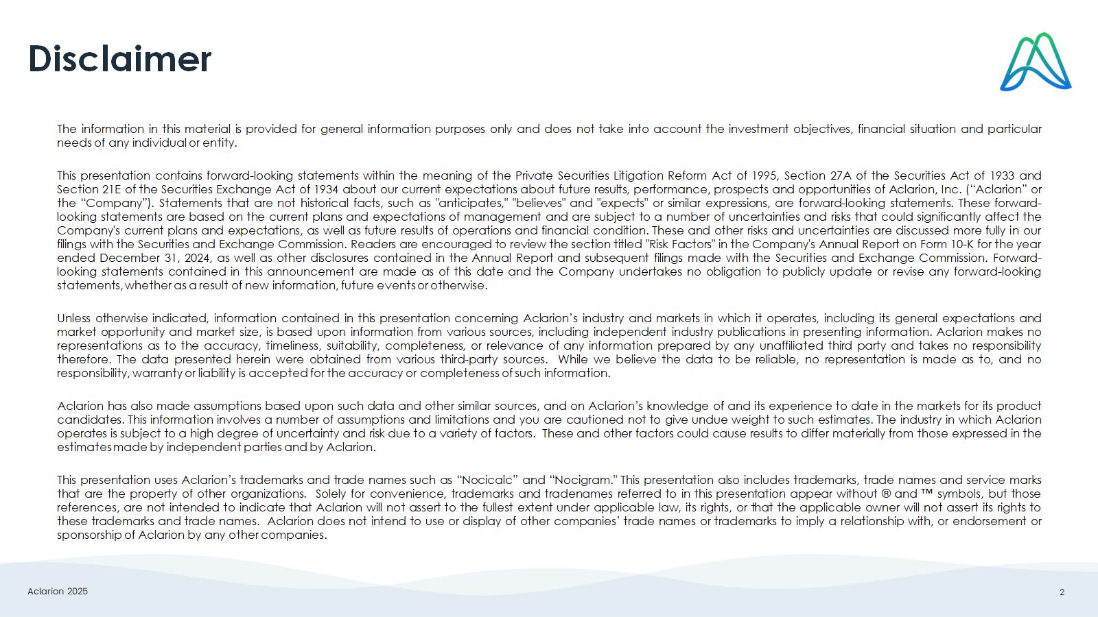 Aclarion 2025 2 Disclaimer The information in this material is provided for general information purposes only and does not take into account the investment objectives, financial situation and particular needs of any individual or entity . This presentation contains forward - looking statements within the meaning of the Private Securities Litigation Reform Act of 1995 , Section 27 A of the Securities Act of 1933 and Section 21 E of the Securities Exchange Act of 1934 about our current expectations about future results, performance, prospects and opportunities of Aclarion, Inc . (“Aclarion” or the “Company”) . Statements that are not historical facts, such as "anticipates," "believes" and "expects" or similar expressions, are forward - looking statements . These forward - looking statements are based on the current plans and expectations of management and are subject to a number of uncertainties and risks that could significantly affect the Company's current plans and expectations, as well as future results of operations and financial condition . These and other risks and uncertainties are discussed more fully in our filings with the Securities and Exchange Commission . Readers are encouraged to review the section titled "Risk Factors" in the Company's Annual Report on Form 10 - K for the year ended December 31 , 2024 , as well as other disclosures contained in the Annual Report and subsequent filings made with the Securities and Exchange Commission . Forward - looking statements contained in this announcement are made as of this date and the Company undertakes no obligation to publicly update or revise any forward - looking statements, whether as a result of new information, future events or otherwise . Unless otherwise indicated, information contained in this presentation concerning Aclarion’s industry and markets in which it operates, including its general expectations and market opportunity and market size, is based upon information from various sources, including independent industry publications in presenting information . Aclarion makes no representations as to the accuracy, timeliness, suitability, completeness, or relevance of any information prepared by any unaffiliated third party and takes no responsibility therefore . The data presented herein were obtained from various third - party sources . While we believe the data to be reliable, no representation is made as to, and no responsibility, warranty or liability is accepted for the accuracy or completeness of such information . Aclarion has also made assumptions based upon such data and other similar sources, and on Aclarion’s knowledge of and its experience to date in the markets for its product candidates . This information involves a number of assumptions and limitations and you are cautioned not to give undue weight to such estimates . The industry in which Aclarion operates is subject to a high degree of uncertainty and risk due to a variety of factors . These and other factors could cause results to differ materially from those expressed in the estimates made by independent parties and by Aclarion . This presentation uses Aclarion’s trademarks and trade names such as “Nocicalc” and “Nocigram . " This presentation also includes trademarks, trade names and service marks that are the property of other organizations . Solely for convenience, trademarks and tradenames referred to in this presentation appear without ® and Œ symbols, but those references, are not intended to indicate that Aclarion will not assert to the fullest extent under applicable law, its rights, or that the applicable owner will not assert its rights to these trademarks and trade names . Aclarion does not intend to use or display of other companies’ trade names or trademarks to imply a relationship with, or endorsement or sponsorship of Aclarion by any other companies .