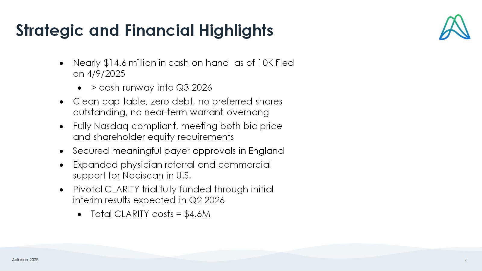 Aclarion 2025 3 Strategic and Financial Highlights  N early $14.6 million in cash on hand as of 10K filed on 4/9/2025  > cash runway into Q3 2026  Clean cap table, zero debt, no preferred shares outstanding, no near - term warrant overhang  Fully Nasdaq compliant, meeting both bid price and shareholder equity requirements  Secured meaningful payer approvals in England  Expanded physician referral and commercial support for Nociscan in U.S.  Pivotal CLARITY trial fully funded through initial interim results expected in Q2 2026  Total CLARITY costs = $4.6M