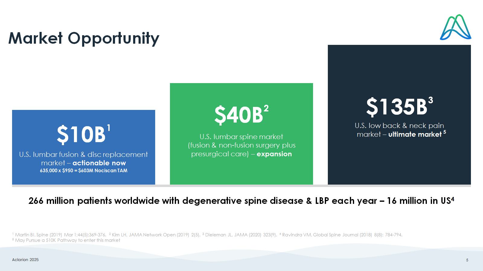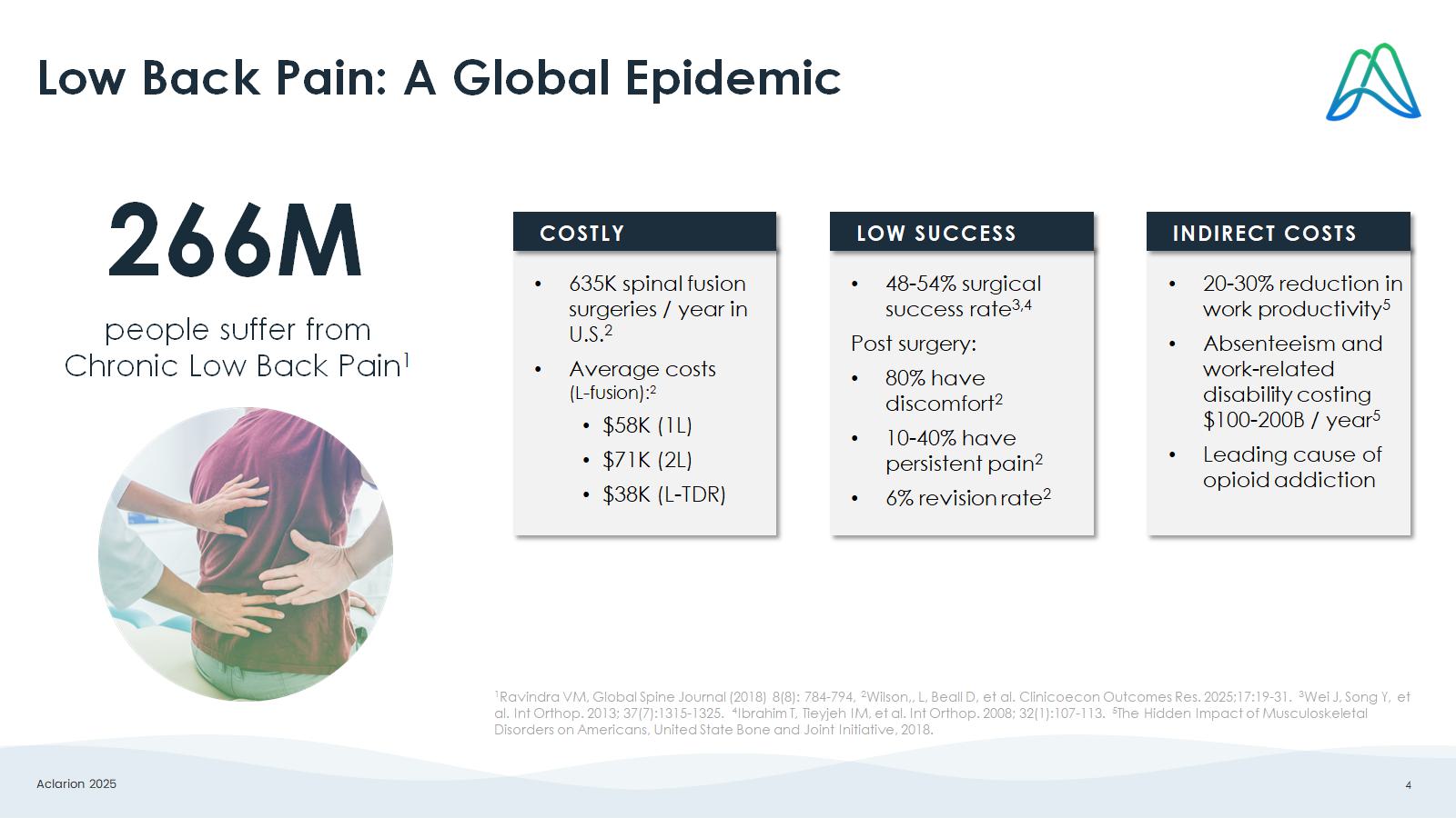 Aclarion 2025 4 Low Back Pain: A Global Epidemic 266M p eople suffer from Chronic Low Back Pain 1 • 20 - 30% reduction in work productivity 5 • Absenteeism and work - related disability costing $100 - 200B / year 5 • Leading cause of opioid addiction INDIRECT COSTS • 635K spinal fusion surgeries / year in U.S. 2 • Average costs (L - fusion): 2 • $58K (1 L) • $71K (2L) • $38K (L - TDR) COSTLY • 48 - 54% surgical success rate 3,4 Post surgery: • 80% have discomfort 2 • 10 - 40% have persistent pain 2 • 6% revision rate 2 LOW SUCCESS 1 Ravindra VM, Global Spine Journal (2018) 8(8): 784 - 794, 2 Wilson,, L, Beall D, et al. Clinicoecon Outcomes Res. 2025;17:19 - 31. 3 Wei J, Song Y, et al. Int Orthop . 2013; 37(7):1315 - 1325. 4 Ibrahim T, Tieyjeh IM, et al. Int Orthop . 2008; 32(1):107 - 113. 5 The Hidden Impact of Musculoskeletal Disorders on Americans, United State Bone and Joint Initiative, 2018.