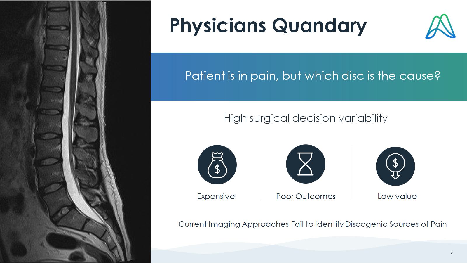 Aclarion 2025 6 Physicians Quandary Patient is in pain, but which disc is the cause? High surgical decision variability Expensive Poor Outcomes Low value Current Imaging Approaches Fail to Identify Discogenic Sources of Pain