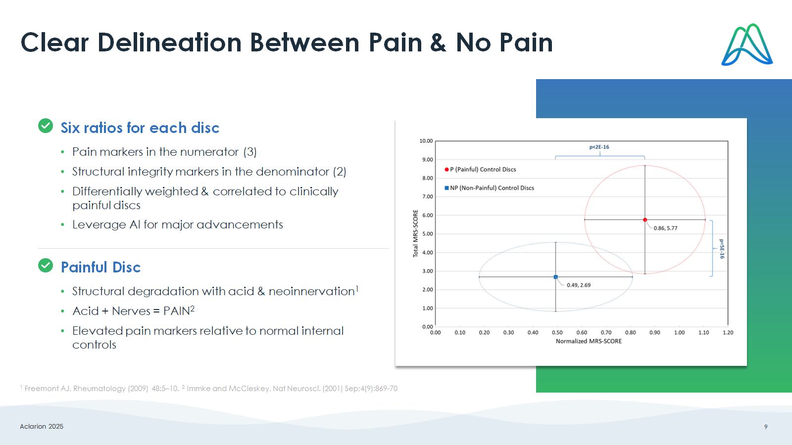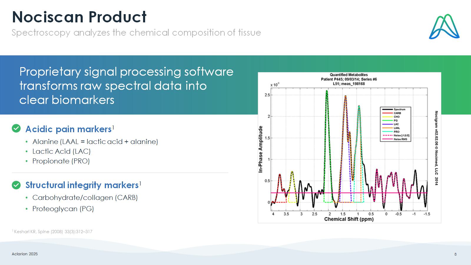 Aclarion 2025 8 Nociscan Product Spectroscopy analyzes the chemical composition of tissue Proprietary signal processing software transforms raw spectral data into clear biomarkers Acidic pain markers 1 • Alanine (LAAL = lactic acid + alanine) • Lactic Acid (LAC) • Propionate (PRO) Structural integrity markers 1 • Carbohydrate/collagen (CARB) • Proteoglycan (PG) 1 Keshari KR, Spine (2008) 33(3):312 – 317