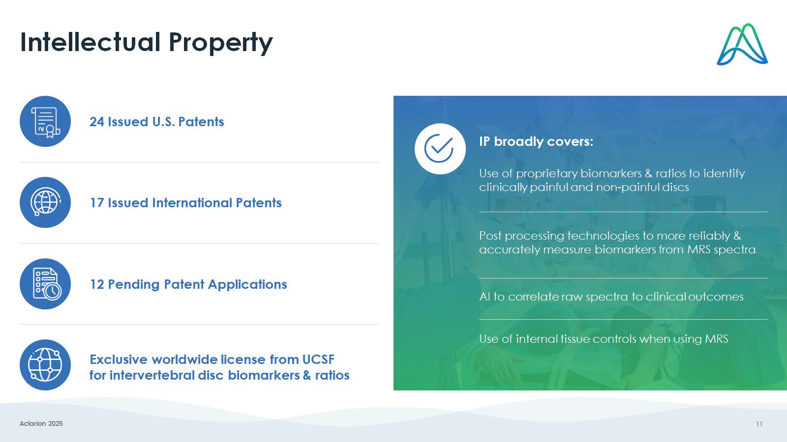 Aclarion 2025 11 Intellectual Property 24 Issued U.S. Patents 17 Issued International Patents Post processing technologies to more reliably & accurately measure biomarkers from MRS spectra Exclusive worldwide license from UCSF for intervertebral disc biomarkers & ratios Use of proprietary biomarkers & ratios to identify clinically painful and non - painful discs 12 Pending Patent Applications IP broadly covers: Use of internal tissue controls when using MRS AI to correlate raw spectra to clinical outcomes