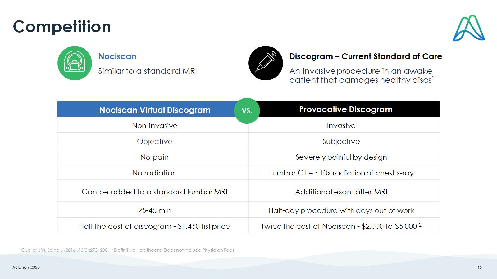 Aclarion 2025 12 Provocative Discogram Nociscan Virtual Discogram Invasive Non - invasive Subjective Objective Severely painful by design No pain Lumbar CT = ~10x radiation of chest x - ray No radiation Additional exam after MRI Can be added to a standard lumbar MRI Half - day procedure with days out of work 25 - 45 min Twice the cost of Nociscan - $2,000 to $5,000 2 Half the cost of discogram - $1,450 list price Competition VS. An invasive procedure in an awake patient that damages healthy discs 1 Discogram – Current Standard of Care Similar to a standard MRI Nociscan 1 Cuellar JM, Spine J (2016),16(3):273 – 280. 2 Definitive Healthcare; Does not include Physician Fees