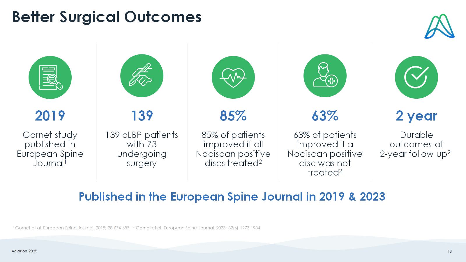 Aclarion 2025 13 Published in the European Spine Journal in 2019 & 2023 Better Surgical Outcomes Gornet study published in European Spine Journal 1 139 cLBP patients with 73 undergoing surgery 85 % of patients improved if all Nociscan positive discs treated 2 63 % of patients improved if a Nociscan positive disc was not treated 2 Durable outcomes at 2 - year follow up 2 2019 139 85 % 63 % 2 year 1 Gornet et al. European Spine Journal. 2019; 28 674 - 687. 2 Gornet et al. European Spine Journal. 2023; 32(6) 1973 - 1984