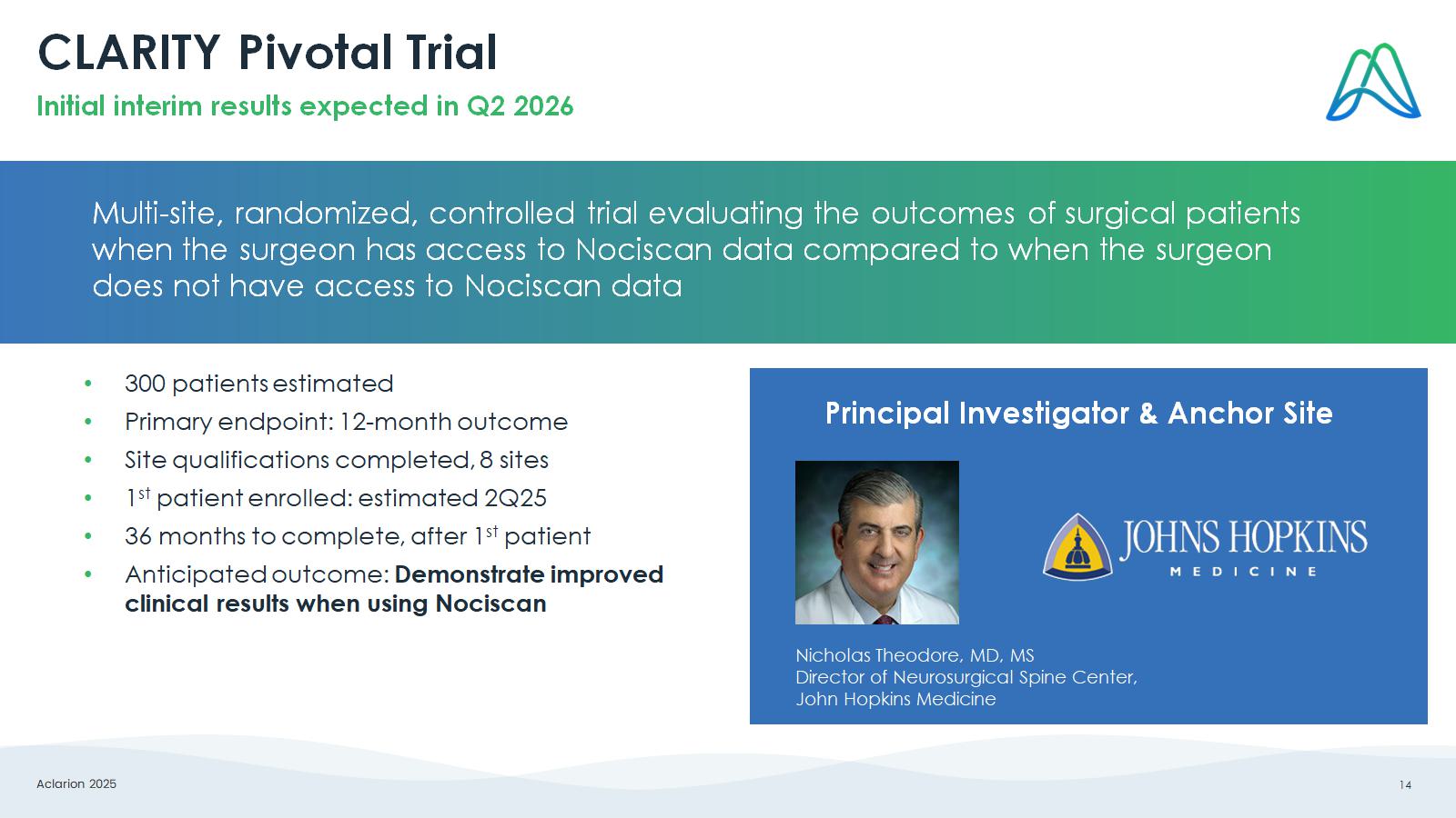 Aclarion 2025 14 CLARITY Pivotal Trial Multi - site, randomized, controlled trial evaluating the outcomes of surgical patients when the surgeon has access to Nociscan data compared to when the surgeon does not have access to Nociscan data Principal Investigator & Anchor Site • 300 patients estimated • Primary endpoint: 12 - month outcome • Site qualifications completed , 8 sites • 1 st patient enrolled : estimated 2Q25 • 36 months to complete, after 1 st patient • Anticipated outcome: Demonstrate improved clinical results when using Nociscan Nicholas Theodore, MD, MS Director of Neurosurgical Spine Center, John Hopkins Medicine Initial interim results expected in Q2 2026