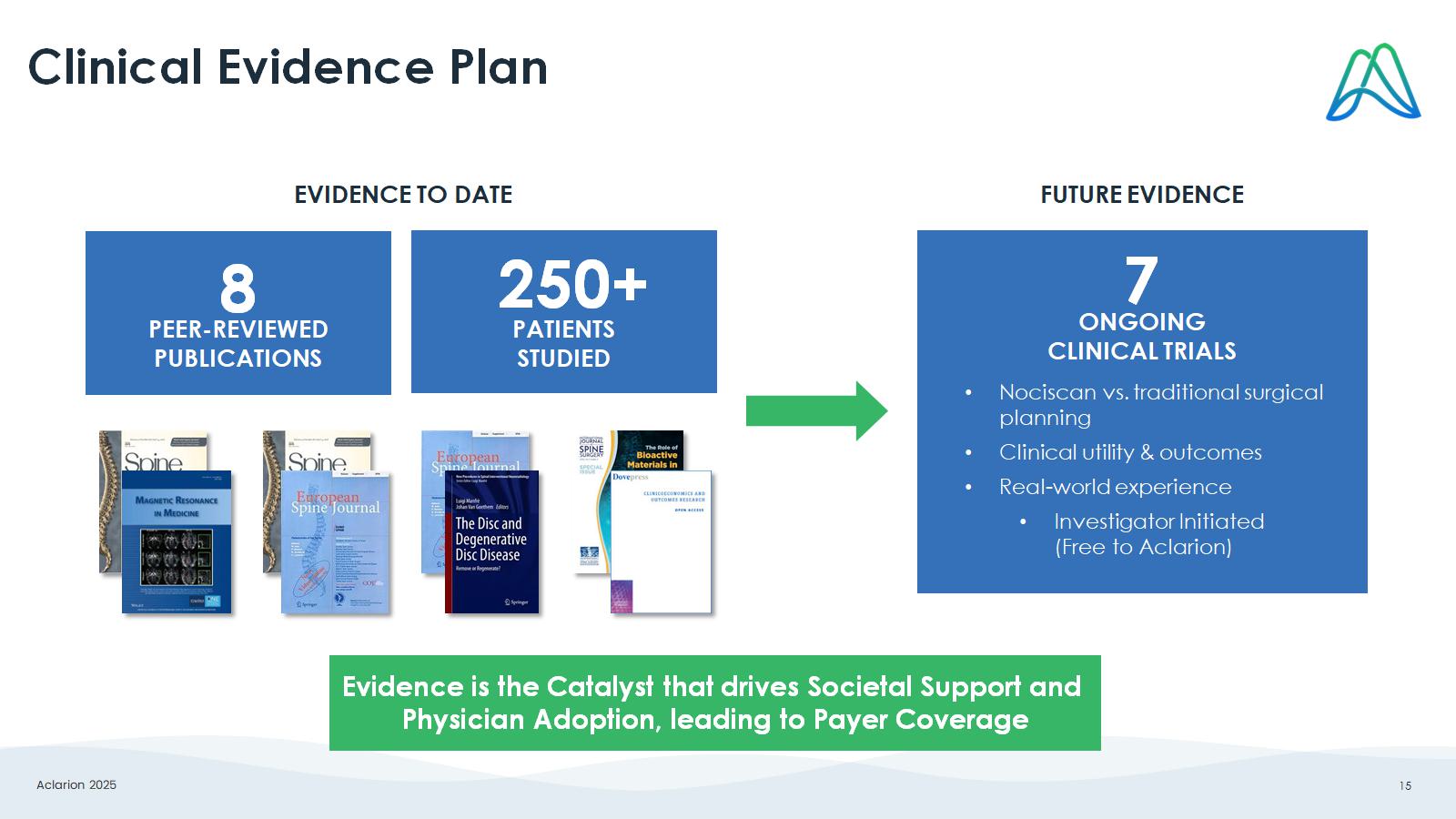 Aclarion 2025 15 Clinical Evidence Plan 7 ONGOING CLINICAL TRIALS FUTURE EVIDENCE • Nociscan vs. traditional surgical planning • Clinical utility & outcomes • Real - world experience • Investigator Initiated (Free to Aclarion ) 8 PEER - REVIEWED PUBLICATIONS EVIDENCE TO DATE 250+ PATIENTS STUDIED Evidence is the Catalyst that drives Societal Support and Physician Adoption, leading to Payer Coverage