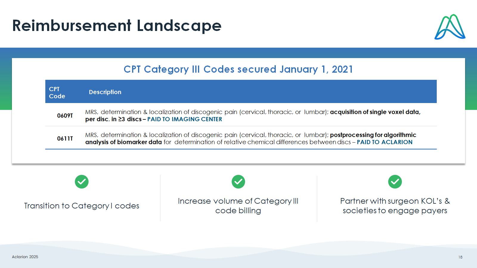 Aclarion 2025 18 Reimbursement Landscape Description CPT Code MRS, determination & localization of discogenic pain (cervical, thoracic, or lumbar); acquisition of single voxel data, per disc , in ≥3 discs – PAID TO IMAGING CENTER 0609T MRS, determination & localization of discogenic pain (cervical, thoracic, or lumbar); postprocessing for algorithmic analysis of biomarker data for determination of relative chemical differences between discs – PAID TO ACLARION 0611T CPT Category III Codes secured January 1, 2021 Transition to Category I codes Increase volume of Category III code billing Partner with surgeon KOL’s & societies to engage payers
