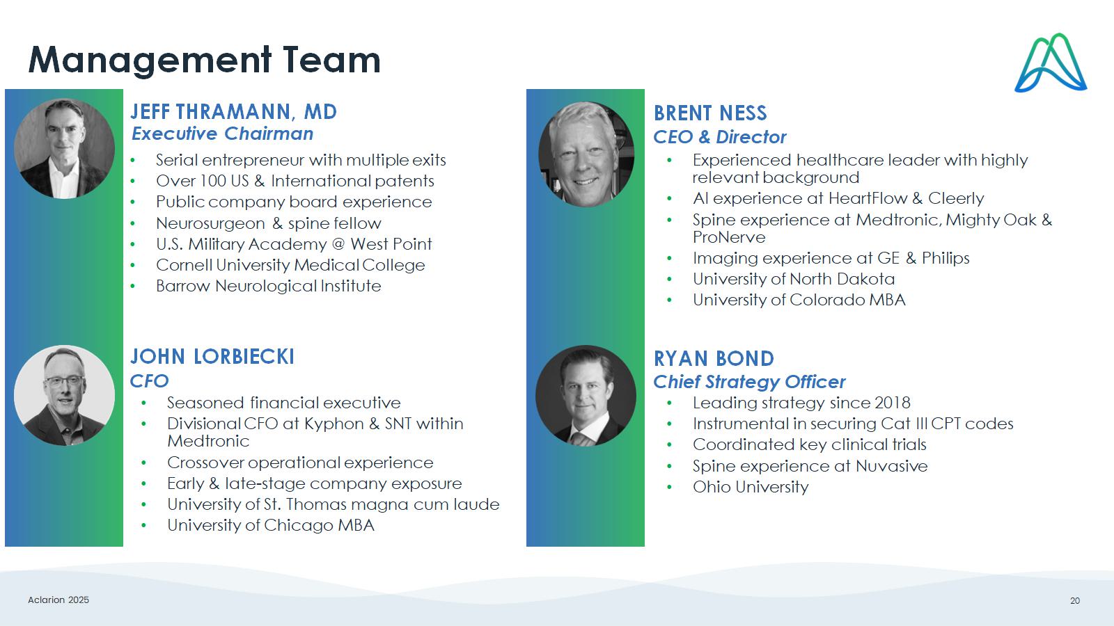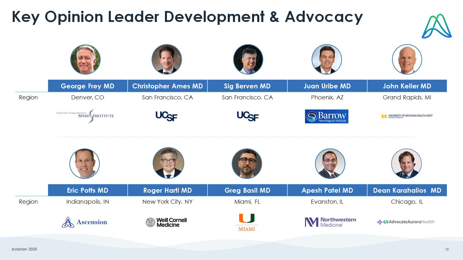 Aclarion 2025 19 Key Opinion Leader Development & Advocacy John Keller MD Juan Uribe MD Sig Berven MD Christopher Ames MD George Frey MD Grand Rapids, MI Phoenix, AZ San Francisco, CA San Francisco, CA Denver, CO Region Dean Karahalios MD Apesh Patel MD Greg Basil MD Roger Hartl MD Eric Potts MD Chicago, IL Evanston, IL Miami, FL New York City, NY Indianapolis, IN Region