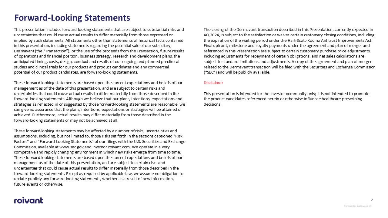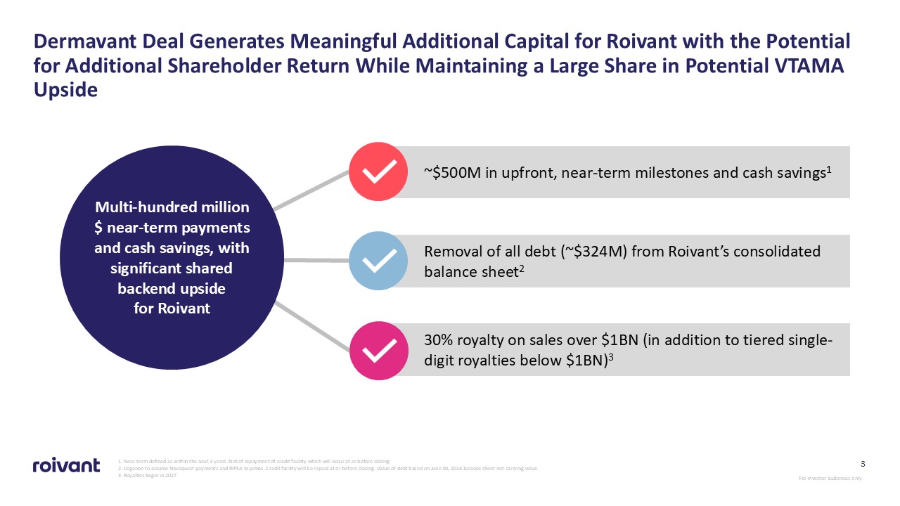 2  Forward-Looking Statements     This presentation includes forward-looking statements that are subject to substantial risks and uncertainties that could cause actual results to differ materially from those expressed or implied by such statements. All statements other than statements of historical facts contained in this presentation, including statements regarding the potential sale of our subsidiary, Dermavant (the “Transaction”), or the use of the proceeds from the Transaction, future results of operations and financial position, business strategy, research and development plans, the anticipated timing, costs, design, conduct and results of our ongoing and planned preclinical studies and clinical trials for our products and product candidates and any commercial potential of our product candidates, are forward-looking statements.  These forward-looking statements are based upon the current expectations and beliefs of our management as of the date of this presentation, and are subject to certain risks and uncertainties that could cause actual results to differ materially from those described in the forward-looking statements. Although we believe that our plans, intentions, expectations and strategies as reflected in or suggested by those forward-looking statements are reasonable, we can give no assurance that the plans, intentions, expectations or strategies will be attained or achieved. Furthermore, actual results may differ materially from those described in the forward-looking statements or may not be achieved at all.  These forward-looking statements may be affected by a number of risks, uncertainties and assumptions, including, but not limited to, those risks set forth in the sections captioned “Risk Factors” and “Forward-Looking Statements” of our filings with the U.S. Securities and Exchange Commission, available at www.sec.gov and investor.roivant.com. We operate in a very competitive and rapidly changing environment in which new risks emerge from time to time. These forward-looking statements are based upon the current expectations and beliefs of our management as of the date of this presentation, and are subject to certain risks and uncertainties that could cause actual results to differ materially from those described in the forward-looking statements. Except as required by applicable law, we assume no obligation to update publicly any forward-looking statements, whether as a result of new information, future events or otherwise.   The closing of the Dermavant transaction described in this Presentation, currently expected in 4Q 2024, is subject to the satisfaction or waiver certain customary closing conditions, including the expiration of the waiting period under the Hart-Scott-Rodino Antitrust Improvements Act. Final upfront, milestone and royalty payments under the agreement and plan of merger and referenced in this Presentation are subject to certain customary purchase price adjustments, including adjustments for repayment of certain obligations, and net sales calculations are subject to standard limitations and adjustments. A copy of the agreement and plan of merger related to the Dermavant transaction will be filed with the Securities and Exchange Commission (“SEC”) and will be publicly available.  Disclaimer     This presentation is intended for the investor community only; it is not intended to promote the product candidates referenced herein or otherwise influence healthcare prescribing decisions.  For investor audiences only
