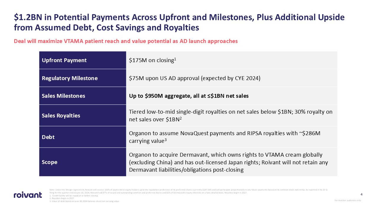 3  Dermavant Deal Generates Meaningful Additional Capital for Roivant with the Potential for Additional Shareholder Return While Maintaining a Large Share in Potential VTAMA Upside  1. Near-term defined as within the next 3 years. Net of repayment of credit facility which will occur at or before closing  2. Organon to assume Novaquest payments and RIPSA royalties. Credit facility will be repaid at or before closing. Value of debt based on June 30, 2024 balance sheet net carrying value  3. Royalties begin in 2027  Multi-hundred million $ near-term payments and cash savings, with significant shared backend upside  for Roivant  ~$500M in upfront, near-term milestones and cash savings1  30% royalty on sales over $1BN (in addition to tiered single-digit royalties below $1BN)3  Removal of all debt (~$324M) from Roivant’s consolidated balance sheet2  For investor audiences only