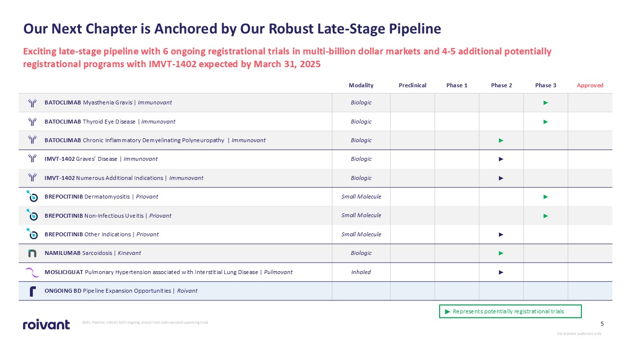 5  Our Next Chapter is Anchored by Our Robust Late-Stage Pipeline  Note: Pipeline reflects both ongoing clinical trials and expected upcoming trials  Represents potentially registrational trials  ►   For investor audiences only  Exciting late-stage pipeline with 6 ongoing registrational trials in multi-billion dollar markets and 4-5 additional potentially registrational programs with IMVT-1402 expected by March 31, 2025  Modality  Preclinical  Phase 1  Phase 2  Phase 3  Approved  BATOCLIMAB Myasthenia Gravis | Immunovant  Biologic  ►  BATOCLIMAB Thyroid Eye Disease | Immunovant  Biologic  ►  BATOCLIMAB Chronic Inflammatory Demyelinating Polyneuropathy  | Immunovant  Biologic  ►  IMVT-1402 Graves’ Disease | Immunovant  Biologic  ►  IMVT-1402 Numerous Additional Indications | Immunovant  Biologic  ►  BREPOCITINIB Dermatomyositis | Priovant  Small Molecule  ►  BREPOCITINIB Non-Infectious Uveitis | Priovant  Small Molecule  ►  BREPOCITINIB Other Indications | Priovant  Small Molecule  ►  NAMILUMAB Sarcoidosis | Kinevant  Biologic  ►  MOSLICIGUAT Pulmonary Hypertension associated with Interstitial Lung Disease | Pulmovant   Inhaled  ►  ONGOING BD Pipeline Expansion Opportunities | Roivant