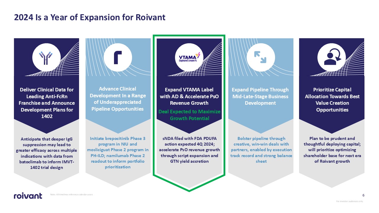 2024 Is a Year of Expansion for Roivant  6   Note: All timelines reference calendar years   Advance Clinical Development In a Range of Underappreciated Pipeline Opportunities   Initiate brepocitinib Phase 3 program in NIU and mosliciguat Phase 2 program in PH-ILD; namilumab Phase 2 readout to inform portfolio prioritization  Expand VTAMA Label with AD & Accelerate PsO Revenue Growth  sNDA filed with FDA PDUFA action expected 4Q 2024; accelerate PsO revenue growth through script expansion and GTN yield accretion  Expand Pipeline Through Mid-Late-Stage Business Development  Deliver Clinical Data for Leading Anti-FcRn Franchise and Announce Development Plans for 1402  Anticipate that deeper IgG suppression may lead to greater efficacy across multiple indications with data from batoclimab to inform IMVT-1402 trial design  Bolster pipeline through creative, win-win deals with partners, enabled by execution track record and strong balance sheet  Prioritize Capital Allocation Towards Best Value Creation Opportunities  Plan to be prudent and thoughtful deploying capital; will prioritize optimizing shareholder base for next era of Roivant growth  For investor audiences only  Deal Expected to Maximize Growth Potential