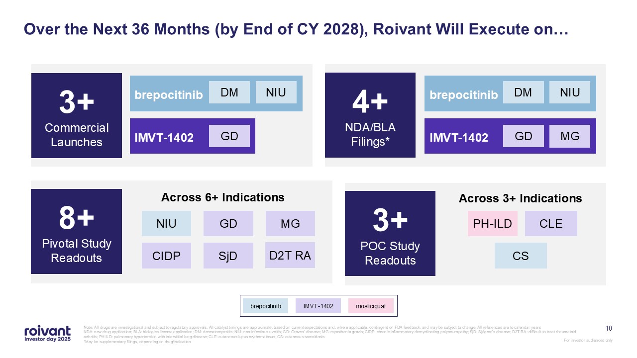 9  Strong Execution With Multiple Positive Updates to Timing Guidance  Note: All drugs are investigational and subject to regulatory approvals. All catalyst timings are approximate, based on current expectations and, where applicable, contingent on FDA feedback, and may be subject to change. All references are to calendar years  DM NDA filing now expected early 2026   previously expected 1H 2026  NIU Ph3 trial fully enrolled with topline data now expected 2H 2026  previously expected 1H 2027  CS Ph2 trial fully enrolled with topline data now expected 1H 2026  previously expected 2H 2026  D2T RA potentially registrational trial topline data now expected 2026  previously period 1 in 2026 and topline in 2027  PH-ILD Ph2b PHocus trial enrolling well with topline data expected 2H 2026   Today's Key Updates  Brepocitinib  IMVT-1402  Mosliciguat  Brepocitinib  Brepocitinib