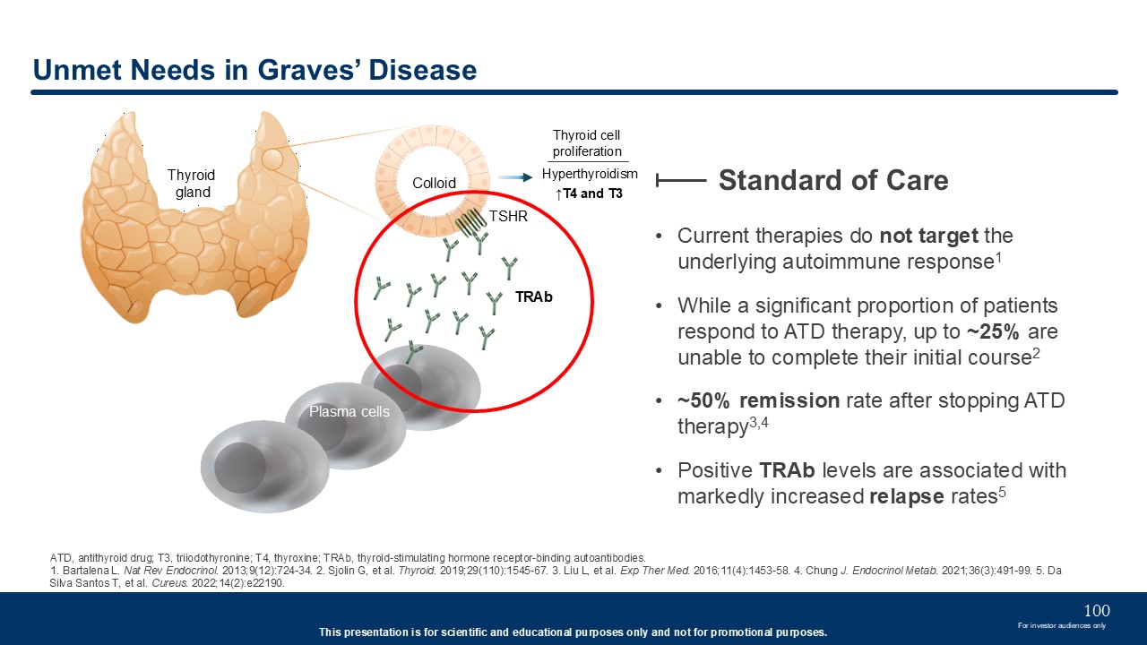 Current therapies do not target the underlying autoimmune response1  While a significant proportion of patients respond to ATD therapy, up to ~25% are unable to complete their initial course2  ~50% remission rate after stopping ATD therapy3,4  Positive TRAb levels are associated with markedly increased relapse rates5  Unmet Needs in Graves’ Disease  Standard of Care  ATD, antithyroid drug; T3, triiodothyronine; T4, thyroxine; TRAb, thyroid-stimulating hormone receptor-binding autoantibodies.  1. Bartalena L. Nat Rev Endocrinol. 2013;9(12):724-34. 2. Sjolin G, et al. Thyroid. 2019;29(110):1545-67. 3. Liu L, et al. Exp Ther Med. 2016;11(4):1453-58. 4. Chung J. Endocrinol Metab. 2021;36(3):491-99. 5. Da Silva Santos T, et al. Cureus. 2022;14(2):e22190.  Hyperthyroidism  ↑T4 and T3  Thyroid gland  TRAb  TSHR  Colloid  Plasma cells  Thyroid cell proliferation  100  For investor audiences only