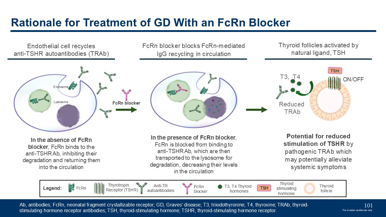 Rationale for Treatment of GD With an FcRn Blocker  FcRn blocker blocks FcRn-mediated  IgG recycling in circulation  In the presence of FcRn blocker, FcRn is blocked from binding to anti-TSHR Ab, which are then transported to the lysosome for degradation, decreasing their levels in the circulation  Lysosome  FcRn blocker  Thyroid follicles activated by  natural ligand, TSH  Reduced  TRAb  T3, T4  ON/OFF  Potential for reduced stimulation of TSHR by pathogenic TRAb which may potentially alleviate systemic symptoms  Anti-TR autoantibodies  FcRn  Legend:  FcRn blocker  Thyrotropin Receptor (TSHR)  T3, T4 Thyroid hormones  TSH  Thyroid stimulating hormone  In the absence of FcRn blocker, FcRn binds to the anti-TSHR Ab, inhibiting their degradation and returning them into the circulation  Endothelial cell recycles  anti-TSHR autoantibodies (TRAb)  Thyroid   follicle  Endosome  Ab, antibodies; FcRn, neonatal fragment crystallizable receptor; GD, Graves’ disease; T3, triiodothyronine; T4, thyroxine; TRAb, thyroid-stimulating hormone receptor antibodies; TSH, thyroid-stimulating hormone; TSHR, thyroid-stimulating hormone receptor.  101  For investor audiences only