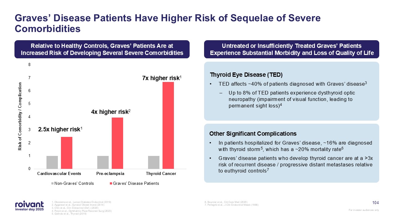 Graves’ Disease Patients Have Higher Risk of Sequelae of Severe Comorbidities  1. Okosieme et al., Lancet Diabetes Endocrinol (2019)  2. Aggarwal et al., Gynecol Obstet Invest (2014)  3. Chin et al., Clin Endocrinol (Oxf.) (2020)  4. Potvin et al., Ophthalmic Plast Reconstr Surg (2023)  5. Galindo et al., Thyroid (2019)  6. Bourcier et al., Crit Care Med (2020)  7. Pellegriti et al., J Clin Endocrinol Metab (1998)  7x higher risk1  4x higher risk2  2.5x higher risk1  Relative to Healthy Controls, Graves’ Patients Are at Increased Risk of Developing Several Severe Comorbidities  Untreated or Insufficiently Treated Graves’ Patients Experience Substantial Morbidity and Loss of Quality of Life   Thyroid Eye Disease (TED)  TED affects ~40% of patients diagnosed with Graves’ disease3  Up to 8% of TED patients experience dysthyroid optic neuropathy (impairment of visual function, leading to permanent sight loss)4  Other Significant Complications  In patients hospitalized for Graves’ disease, ~16% are diagnosed with thyroid storm5, which has a ~20% mortality rate6  Graves’ disease patients who develop thyroid cancer are at a >3x risk of recurrent disease / progressive distant metastases relative to euthyroid controls7  104