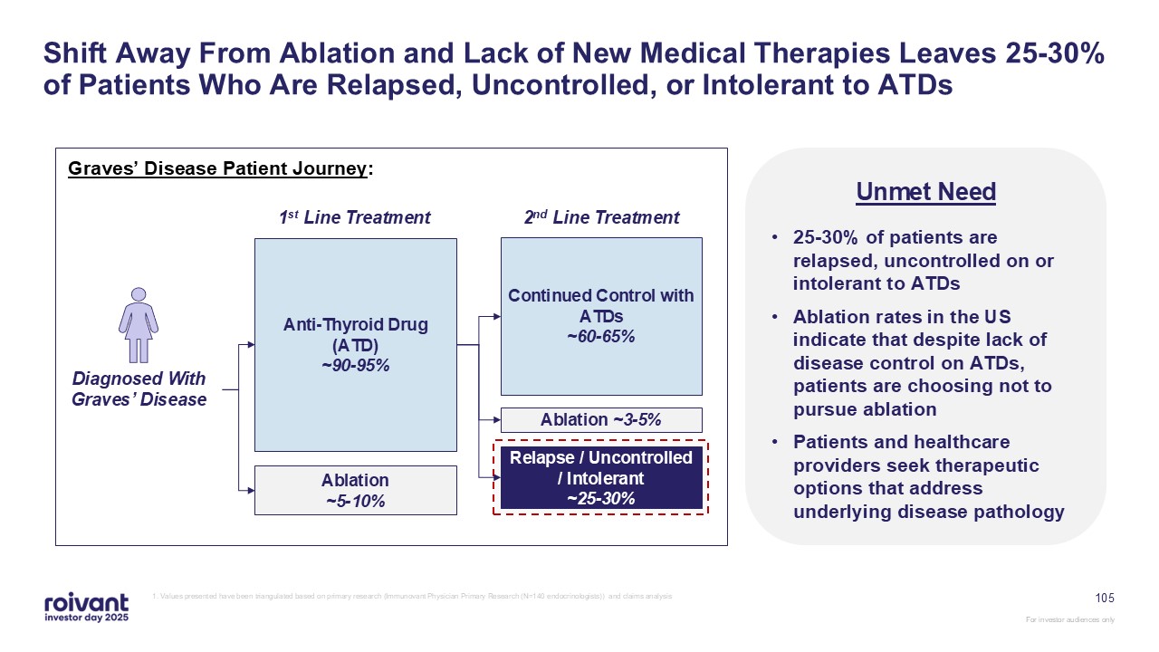 Graves’ Disease Market Opportunity Includes Annual Incident Population and a Significant Untapped Prevalent Patient Pool   Annual Market of 2nd Line Incident Uncontrolled Patients  ~7K  1st Line Ablation  ~34K  Continued ATD Remission3,4  ~65K  Annual Diagnosed & Treated U.S. Adult Population1  ~58K  Receive 1st Line ATD1  ~20K  ~2K  Ablation2  Incident Graves’ Disease Patients  Prevalent Pool of ATD Relapse Patients  ~120K  Ablation6  ~420K  Continued ATD Remission  ~880K  Diagnosed U.S. Adult Population5  ~760K  Received 1st Line ATD  ~330K  ~10K  Ablation9  Prevalent Graves’ Disease Patients  108  1. Roivant Claims Analysis – 2021 incident patient population, first-line treatment is primary treatment in the first-year post diagnosis, claims review included a five-year lookback to define the incident population 2. Grove-Laugesen et al., Thyroid (2023): Completer rates for combined arms: ATD remission 56.0%, continuing ATD 18.8%, ATD relapse of 21.8%, ablation of 3.4%. Of the 58K 1st line ATD patients, a total of ~75% are either in remission (56.0%: 32.5K) or continued ATDs (18.8%: 10.9K) 3. Azizi et al., Thyroid (2019): ATD remission for patients on long-term ATDs is 85%. Of the 10.9K patients who continued ATDs, 15% relapse (1.6K) and 85% go into remission (9.3K). These 9.3K patients in remission will have a 15% rate of relapse resulting in 1.4K relapses. From the original 10.9K patients who continued on ATDs, there will be a total of 3K (1.4K +1.6K) relapses, 4. Stokland et al., J Clin Endocrinol Metab. (2023): Relapse post remission 15%. Of the 42K patients who are in remission, 15% will relapse (6.3K). In total, the late relapses from remission and continued ATDs will be ~9.3K, resulting in a weighted average relapse rate of ~19% (6.3K relapses from the 32.5K patients in remission averaged with the 3K relapses from the 10.5K patients who continued on ATDs). 5.Roivant Claims Analysis – 2022 prevalent patient population based on a two-year lookback for diagnosis. Of the 120K patients ablated, ~80K were ablated prior to 2021 and ~40K were ablated in 2021/2022 6.Azizi et al., Thyroid (2019): Relapse rate was calculated as a weighted average considering relapse rate in patients on ATDs <18months is 53% compared to patients on ATDs >18months is 15%. Of the 570K patients treated with ATDs, ~470K are on ATDs <18months and ~100K are on ATDs for >18months. Rates have been applied proportionally. 7.Bandai et al., Endocr J (2019): Of the ~190K patients previously treated with ATDs and currently monitored off-therapy, ~40% experience relapse, which is 75K. 8.Grove-Laugesen et al., Thyroid (2023): 3.4% of ATD relapse patients will pursue ablation. 3.4% applied to the ~340K ATD treatment relapse patients is ~10K