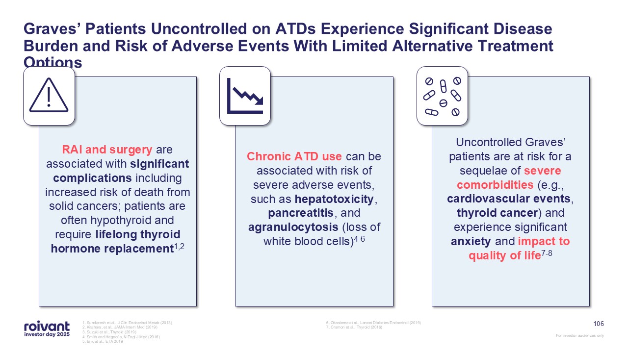 RAI and surgery are associated with significant complications including increased risk of death from solid cancers; patients are often hypothyroid and require lifelong thyroid hormone replacement1,2  106  Graves’ Patients Uncontrolled on ATDs Experience Significant Disease Burden and Risk of Adverse Events With Limited Alternative Treatment Options  Chronic ATD use can be associated with risk of severe adverse events, such as hepatotoxicity, pancreatitis, and agranulocytosis (loss of white blood cells)4-6  Uncontrolled Graves’ patients are at risk for a sequelae of severe comorbidities (e.g., cardiovascular events, thyroid cancer) and experience significant anxiety and impact to quality of life7-8  1. Sundaresh et al., J Clin Endocrinol Metab (2013)  2. Kitahara, et al., JAMA Intern Med (2019)  3. Suzuki et al., Thyroid (2019)  4. Smith and Hegedüs, N Engl J Med (2016)  5. Brix et al., ETA 2019  6. Okosieme et al., Lancet Diabetes Endocrinol (2019)  7. Cramon et al., Thyroid (2016)