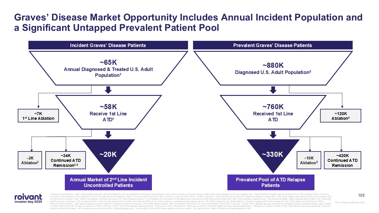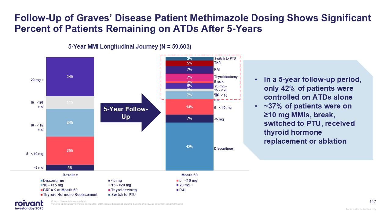 107  Follow-Up of Graves’ Disease Patient Methimazole Dosing Shows Significant Percent of Patients Remaining on ATDs After 5-Years  Source: Roivant claims analysis  Patients continuously enrolled from 2016 - 2024, newly diagnosed in 2019, 5 years of follow up data from initial MMI script  5-Year Follow-Up  In a 5-year follow-up period, only 42% of patients were controlled on ATDs alone  ~37% of patients were on ≥10 mg MMIs, break, switched to PTU, received thyroid hormone replacement or ablation  <5 mg  5 - < 10 mg  10 - < 15 mg  15 - < 20 mg   20 mg +  <5 mg  5 - < 10 mg  10 - < 15 mg  15 - < 20 mg   20 mg +  Break  Switch to PTU  THR  RAI  Thyroidectomy  Discontinue
