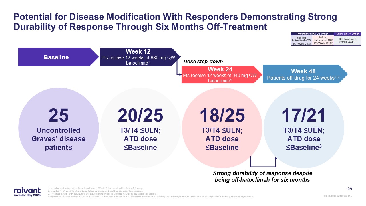 Potential for Disease Modification With Responders Demonstrating Strong Durability of Response Through Six Months Off-Treatment  25   Uncontrolled Graves’ disease patients  Baseline  Week 48   Patients off-drug for 24 weeks1,2  Week 12  Pts receive 12 weeks of 680 mg QW batoclimab1  Week 24  Pts receive 12 weeks of 340 mg QW batoclimab1  20/25   T3/T4 ≤ULN; ATD dose ≤Baseline  18/25   T3/T4 ≤ULN; ATD dose ≤Baseline  17/21   T3/T4 ≤ULN; ATD dose ≤Baseline3  Strong durability of response despite being off-batoclimab for six months  Dose step-down  1. Includes N=1 patient who discontinued prior to Week 12 but remained in off-drug follow-up.   2. Includes N=21 patients who entered follow-up period and could be assessed for remission.   3. N=1 patient had T3/T4 ≤ULN, and one day following Week 48 visit had ATD dose equivalent to baseline.  Responders: Patients who have T3 and T4 values ≤ULN and no increase in ATD dose from baseline. Pts: Patients; T3: Triiodothyronine; T4: Thyroxine; ULN: Upper limit of normal; ATD: Anti-thyroid drug.  109  340 mg batoclimab QW SC (Week 12-24)  680 mg batoclimab QW SC (Week 0-12)  Treatment Period: 24 weeks  Off-Treatment  (Week 24-48)  Follow-up: 24 weeks