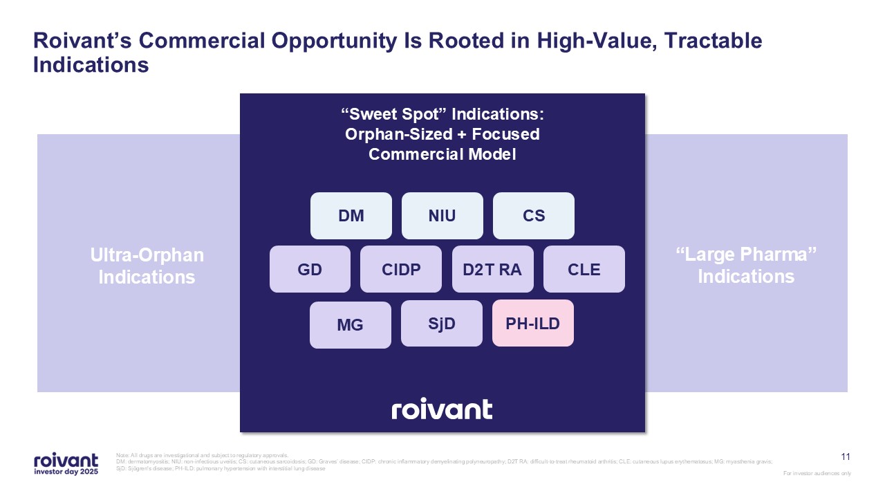 10  Over the Next 36 Months (by End of CY 2028), Roivant Will Execute on…  Note: All drugs are investigational and subject to regulatory approvals. All catalyst timings are approximate, based on current expectations and, where applicable, contingent on FDA feedback, and may be subject to change. All references are to calendar years  NDA: new drug application; BLA: biologics license application; DM: dermatomyositis; NIU: non-infectious uveitis; GD: Graves’ disease; MG: myasthenia gravis; CIDP: chronic inflammatory demyelinating polyneuropathy; SjD: Sjögren's disease; D2T RA: difficult-to-treat rheumatoid arthritis; PH-ILD: pulmonary hypertension with interstitial lung disease; CLE: cutaneous lupus erythematosus; CS: cutaneous sarcoidosis   *May be supplementary filings, depending on drug/indication  4+  NDA/BLA Filings*  8+  Pivotal Study Readouts  3+  POC Study Readouts  Across 3+ Indications  PH-ILD  CS  CLE  Across 6+ Indications  NIU  GD  MG  CIDP  SjD  D2T RA  brepocitinib  IMVT-1402  GD  MG  NIU  DM  3+  Commercial Launches  brepocitinib  IMVT-1402  mosliciguat  brepocitinib  IMVT-1402  GD  NIU  DM