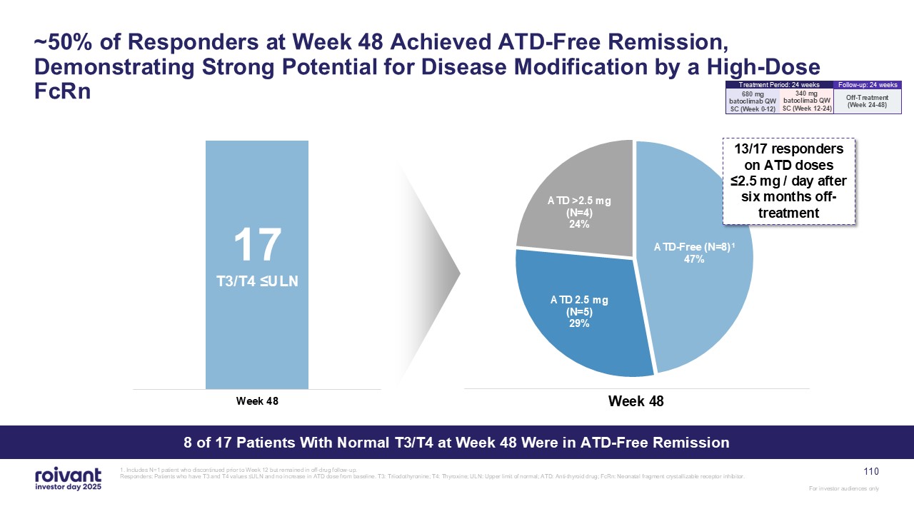 ~50% of Responders at Week 48 Achieved ATD-Free Remission, Demonstrating Strong Potential for Disease Modification by a High-Dose FcRn  8 of 17 Patients With Normal T3/T4 at Week 48 Were in ATD-Free Remission  17  T3/T4 ≤ULN   Week 48  13/17 responders on ATD doses ≤2.5 mg / day after six months off-treatment  1. Includes N=1 patient who discontinued prior to Week 12 but remained in off-drug follow-up.  Responders: Patients who have T3 and T4 values ≤ULN and no increase in ATD dose from baseline. T3: Triiodothyronine; T4: Thyroxine; ULN: Upper limit of normal; ATD: Anti-thyroid drug; FcRn: Neonatal fragment crystallizable receptor inhibitor.   110  340 mg batoclimab QW SC (Week 12-24)  680 mg batoclimab QW SC (Week 0-12)  Treatment Period: 24 weeks  Off-Treatment  (Week 24-48)  Follow-up: 24 weeks