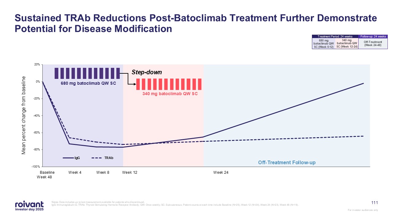 Off-Treatment Follow-up  Mean percent change from baseline   Baseline Week 4 Week 8 Week 12 Week 24 Week 48   340 mg batoclimab QW SC  680 mg batoclimab QW SC  Step-down  Sustained TRAb Reductions Post-Batoclimab Treatment Further Demonstrate Potential for Disease Modification  Notes: Data includes up to last measurement available for patients who discontinued.   IgG: Immunoglobulin G; TRAb: Thyroid Stimulating Hormone Receptor Antibody; QW: Once weekly; SC: Subcutaneous. Patient counts at each time include Baseline (N=25), Week 12 (N=24), Week 24 (N=23), Week 48 (N=19).  111  340 mg batoclimab QW SC (Week 12-24)  680 mg batoclimab QW SC (Week 0-12)  Treatment Period: 24 weeks  Off-Treatment  (Week 24-48)  Follow-up: 24 weeks