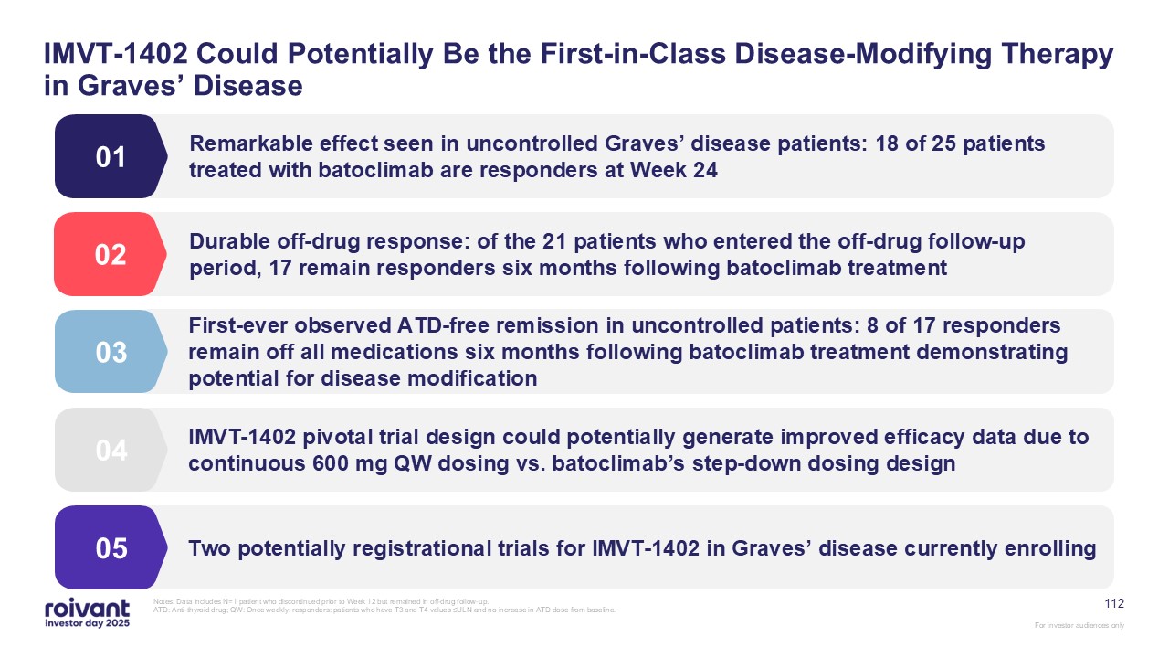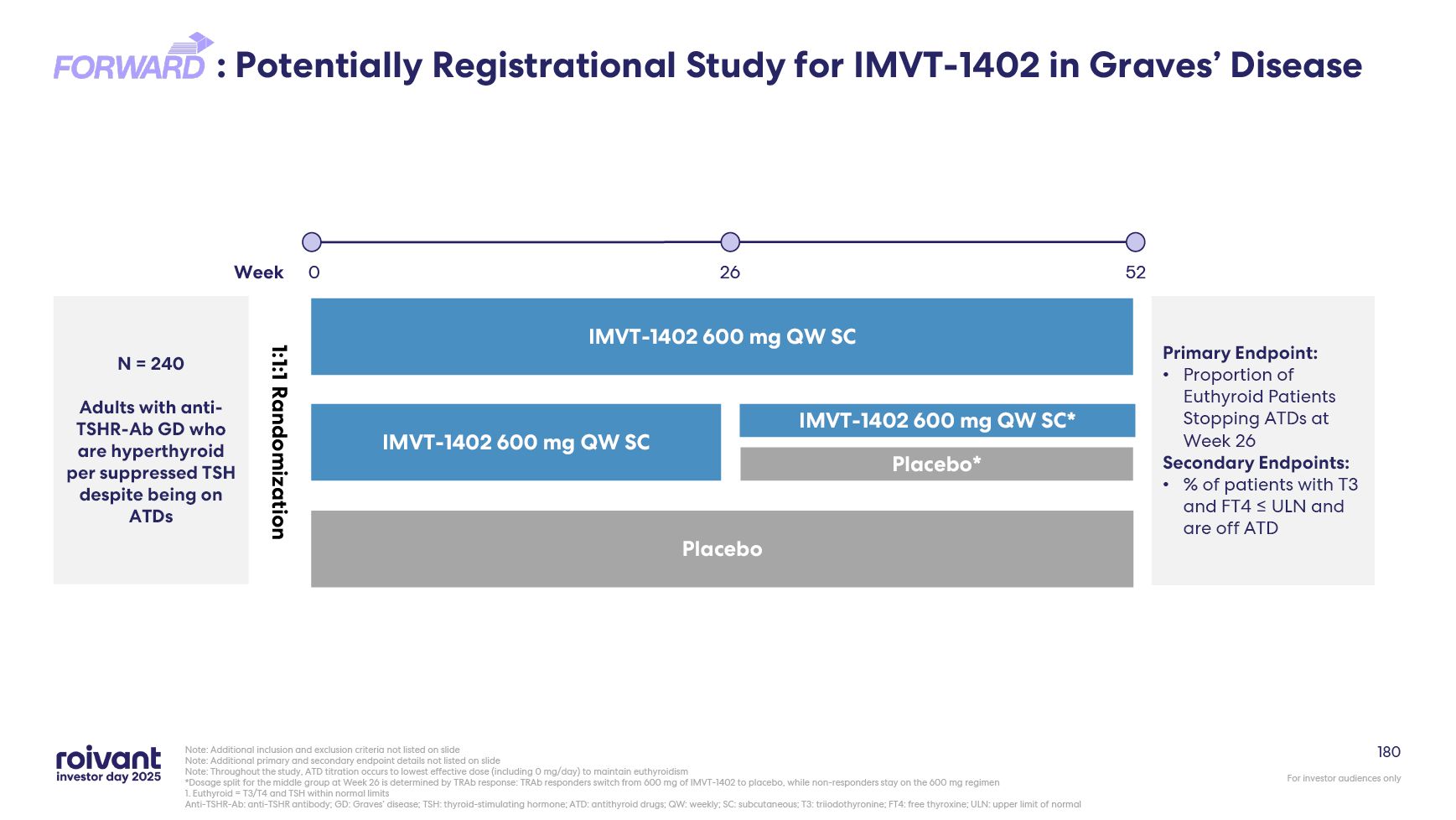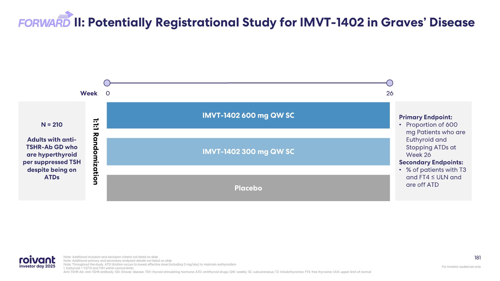 180   : Potentially Registrational Study for IMVT-1402 in Graves’ Disease   Note: Additional inclusion and exclusion criteria not listed on slide  Note: Additional primary and secondary endpoint details not listed on slide  Note: Throughout the study, ATD titration occurs to lowest effective dose (including 0 mg/day) to maintain euthyroidism  *Dosage split for the middle group at Week 26 is determined by TRAb response: TRAb responders switch from 600 mg of IMVT-1402 to placebo, while non-responders stay on the 600 mg regimen  1. Euthyroid = T3/T4 and TSH within normal limits  Anti-TSHR-Ab: anti-TSHR antibody; GD: Graves’ disease; TSH: thyroid-stimulating hormone; ATD: antithyroid drugs; QW: weekly; SC: subcutaneous; T3: triiodothyronine; FT4: free thyroxine; ULN: upper limit of normal  N = 240  Adults with anti-TSHR-Ab GD who are hyperthyroid per suppressed TSH despite being on ATDs  52  26  IMVT-1402 600 mg QW SC  Placebo  IMVT-1402 600 mg QW SC  IMVT-1402 600 mg QW SC*  Placebo*  Week  Primary Endpoint:   Proportion of Euthyroid Patients Stopping ATDs at Week 26  Secondary Endpoints:  % of patients with T3 and FT4 ≤ ULN and are off ATD  1:1:1 Randomization  0