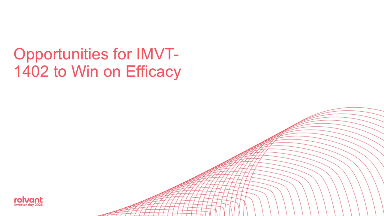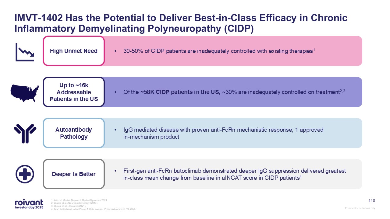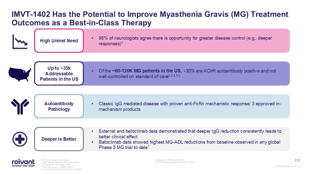 117  IMVT-1402 Has the Potential to Improve Myasthenia Gravis (MG) Treatment Outcomes as a Best-in-Class Therapy  AChR: anti-acetylcholine receptor   1. IMVT Market Research HCP Unmet Need  2. Phillips et al., Neurology (1992)   3. Mina-Osorio et al., AANEM (2023)  4. Lazaridis and Tzartos, Front Immunol (2020)  5. Wang et al., BMC Neurol (2017)  6. IMVT Investor Presentation March 19, 2025  Deeper Is Better  External and batoclimab data demonstrated that deeper IgG reduction consistently leads to better clinical effect  Batoclimab data showed highest MG-ADL reductions from baseline observed in any global Phase 3 MG trial to date7  Up to ~35k Addressable Patients in the US  Of the ~60-120K MG patients in the US, ~30% are AChR autoantibody positive and not well-controlled on standard of care2,3,4,5,6  Autoantibody Pathology  Classic IgG mediated disease with proven anti-FcRn mechanistic response; 3 approved in-mechanism products  High Unmet Need  95% of neurologists agree there is opportunity for greater disease control (e.g., deeper responses)1