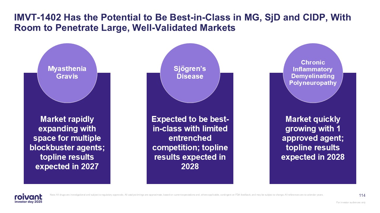 114  IMVT-1402 Has the Potential to Be Best-in-Class in MG, SjD and CIDP, With Room to Penetrate Large, Well-Validated Markets  Note: All drugs are investigational and subject to regulatory approvals. All catalyst timings are approximate, based on current expectations and, where applicable, contingent on FDA feedback, and may be subject to change. All references are to calendar years.  Market rapidly expanding with space for multiple blockbuster agents;   topline results expected in 2027  Myasthenia Gravis  Expected to be best-in-class with limited entrenched competition; topline results expected in 2028  Sjögren’s Disease  Market quickly growing with 1 approved agent;   topline results expected in 2028  Chronic Inflammatory Demyelinating Polyneuropathy