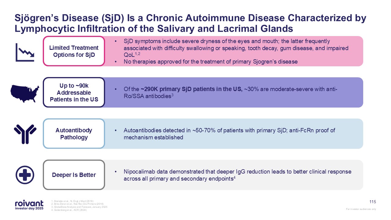 115  Sjögren’s Disease (SjD) Is a Chronic Autoimmune Disease Characterized by Lymphocytic Infiltration of the Salivary and Lacrimal Glands  1. Mariette et al., N. Engl J Med (2018)  2. Brito-Zeron et al., Nat Rev Dis Primers (2016)  3. GlobalData Analysis and Forecast, January 2025  4. Gottenberg et al., ACR (2024)  Deeper Is Better  Nipocalimab data demonstrated that deeper IgG reduction leads to better clinical response across all primary and secondary endpoints4  Up to ~90k Addressable Patients in the US  Of the ~290K primary SjD patients in the US, ~30% are moderate-severe with anti-Ro/SSA antibodies3  Autoantibody Pathology  Autoantibodies detected in ~50-70% of patients with primary SjD; anti-FcRn proof of mechanism established   Limited Treatment Options for SjD  SjD symptoms include severe dryness of the eyes and mouth; the latter frequently associated with difficulty swallowing or speaking, tooth decay, gum disease, and impaired QoL1,2  No therapies approved for the treatment of primary Sjogren’s disease