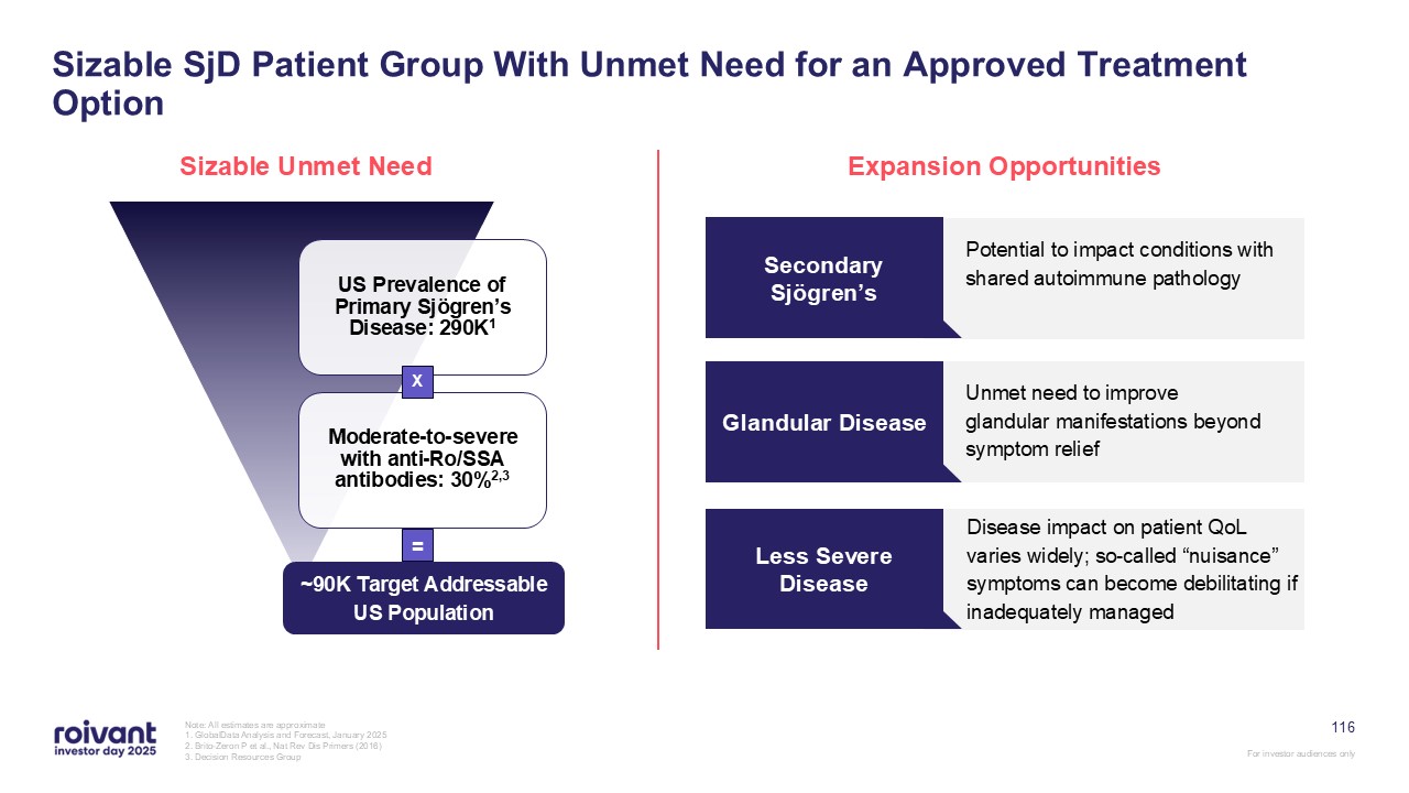 Sizable SjD Patient Group With Unmet Need for an Approved Treatment Option  Sizable Unmet Need  Expansion Opportunities  Potential to impact conditions with shared autoimmune pathology  Secondary Sjögren’s  Unmet need to improve glandular manifestations beyond symptom relief  Glandular Disease  Disease impact on patient QoL varies widely; so-called “nuisance” symptoms can become debilitating if inadequately managed  Less Severe Disease  ~90K Target Addressable US Population  X  =  116  Note: All estimates are approximate  1. GlobalData Analysis and Forecast, January 2025  2. Brito-Zeron P et al., Nat Rev Dis Primers (2016)  3. Decision Resources Group