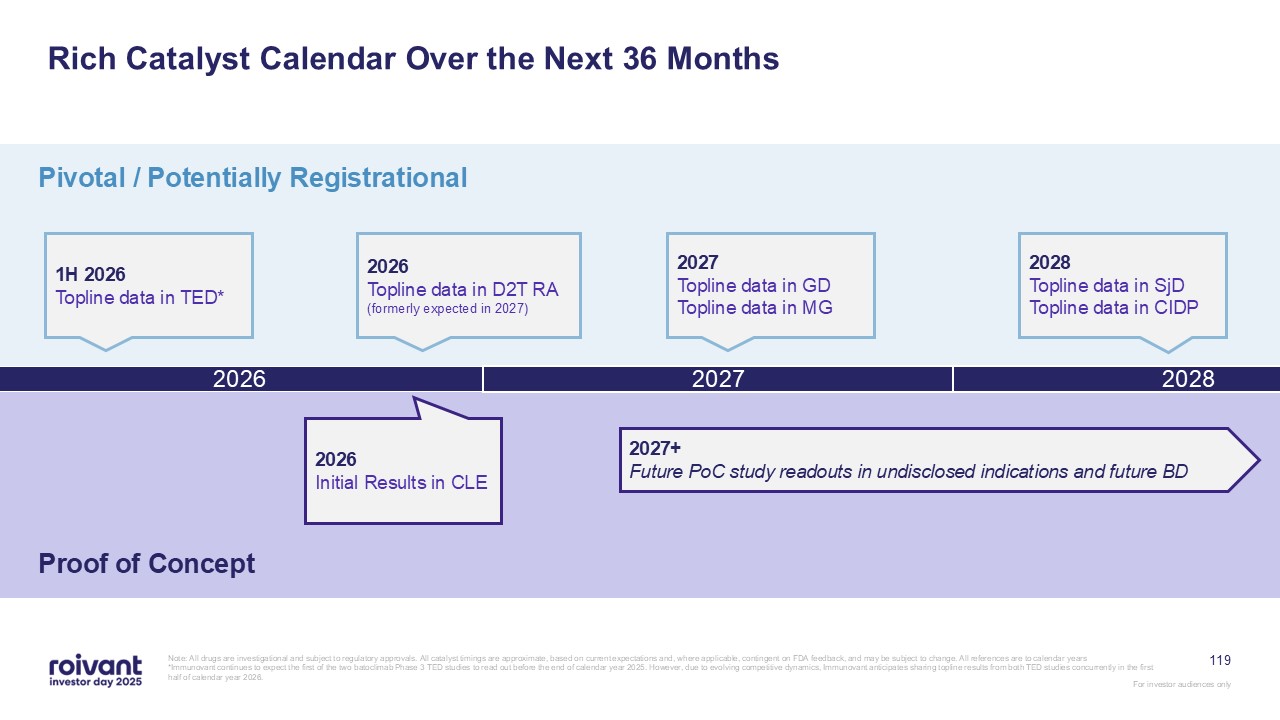 Rich Catalyst Calendar Over the Next 36 Months  2026  Pivotal / Potentially Registrational  Proof of Concept  1H 2026  Topline data in TED*  Note: All drugs are investigational and subject to regulatory approvals. All catalyst timings are approximate, based on current expectations and, where applicable, contingent on FDA feedback, and may be subject to change. All references are to calendar years  *Immunovant continues to expect the first of the two batoclimab Phase 3 TED studies to read out before the end of calendar year 2025. However, due to evolving competitive dynamics, Immunovant anticipates sharing topline results from both TED studies concurrently in the first half of calendar year 2026.  2027  2028  2026  Topline data in D2T RA (formerly expected in 2027)   2026  Initial Results in CLE  2027  Topline data in GD  Topline data in MG  2028  Topline data in SjD  Topline data in CIDP  119  2027+  Future PoC study readouts in undisclosed indications and future BD