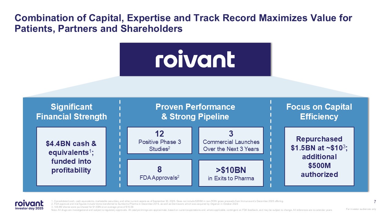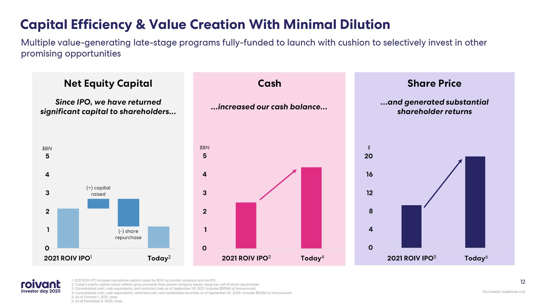 12  Capital Efficiency & Value Creation With Minimal Dilution  1. 2021 ROIV IPO includes cumulative capital raised by ROIV as private company and via IPO  2. Today’s equity capital raised reflects gross proceeds from parent company equity issuances, net of share repurchases  3. Consolidated cash, cash equivalents, and restricted cash as of September 30, 2021; includes $559M at Immunovant  4. Consolidated cash, cash equivalents, restricted cash, and marketable securities as of September 30, 2025; includes $522M at Immunovant  5. As of October 1, 2021, close  6. As of December 5, 2025, close  Multiple value-generating late-stage programs fully-funded to launch with cushion to selectively invest in other promising opportunities  Cash  Net Equity Capital  Share Price  $BN  $  Today4  2021 ROIV IPO3  Today6  2021 ROIV IPO5  2021 ROIV IPO1  Today2  $BN  Since IPO, we have returned significant capital to shareholders…  …increased our cash balance…  …and generated substantial shareholder returns  (+) capital raised  (-) share repurchase