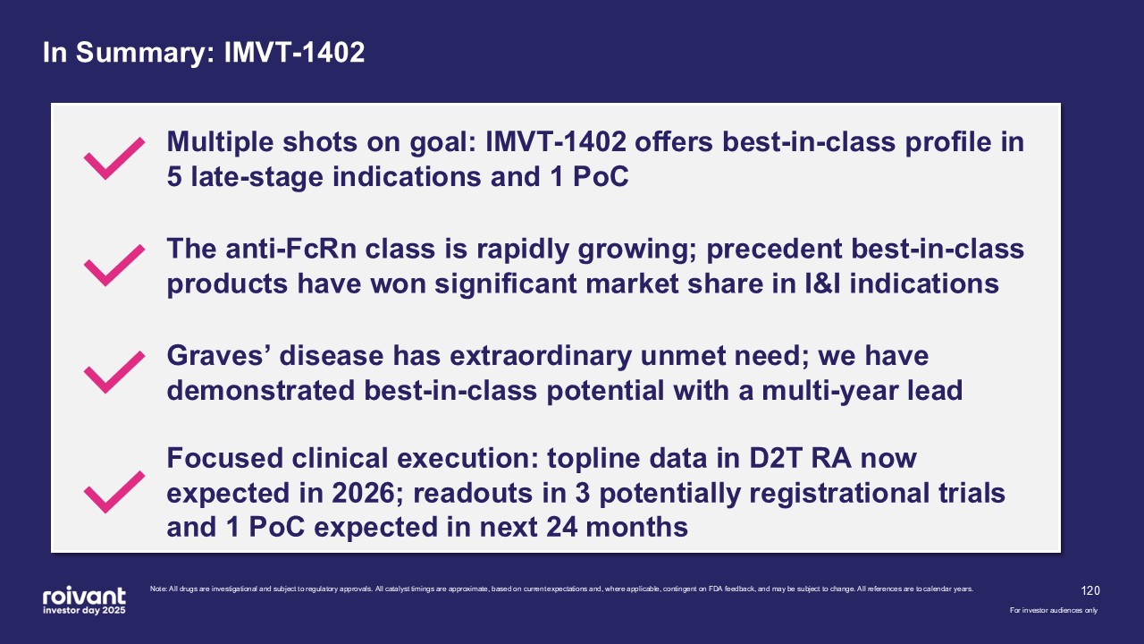 120  In Summary: IMVT-1402  Focused clinical execution: topline data in D2T RA now expected in 2026; readouts in 3 potentially registrational trials and 1 PoC expected in next 24 months  The anti-FcRn class is rapidly growing; precedent best-in-class products have won significant market share in I&I indications  Graves’ disease has extraordinary unmet need; we have demonstrated best-in-class potential with a multi-year lead  Multiple shots on goal: IMVT-1402 offers best-in-class profile in 5 late-stage indications and 1 PoC   Note: All drugs are investigational and subject to regulatory approvals. All catalyst timings are approximate, based on current expectations and, where applicable, contingent on FDA feedback, and may be subject to change. All references are to calendar years.  For investor audiences only