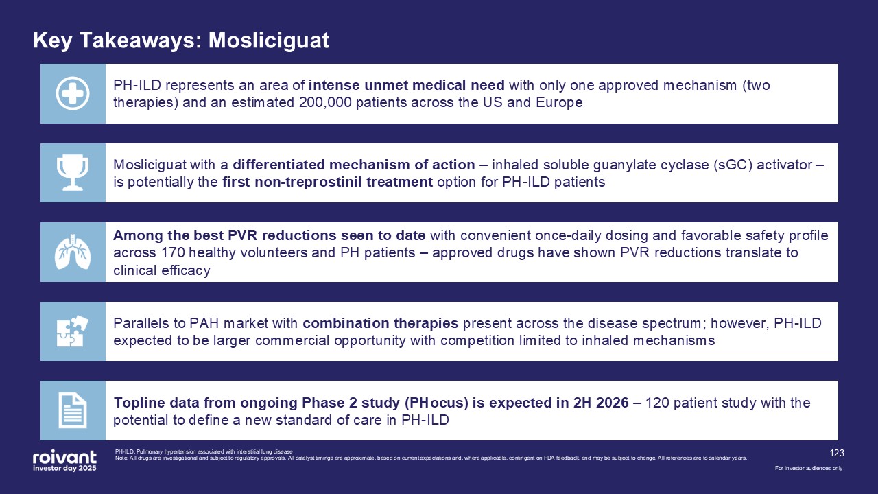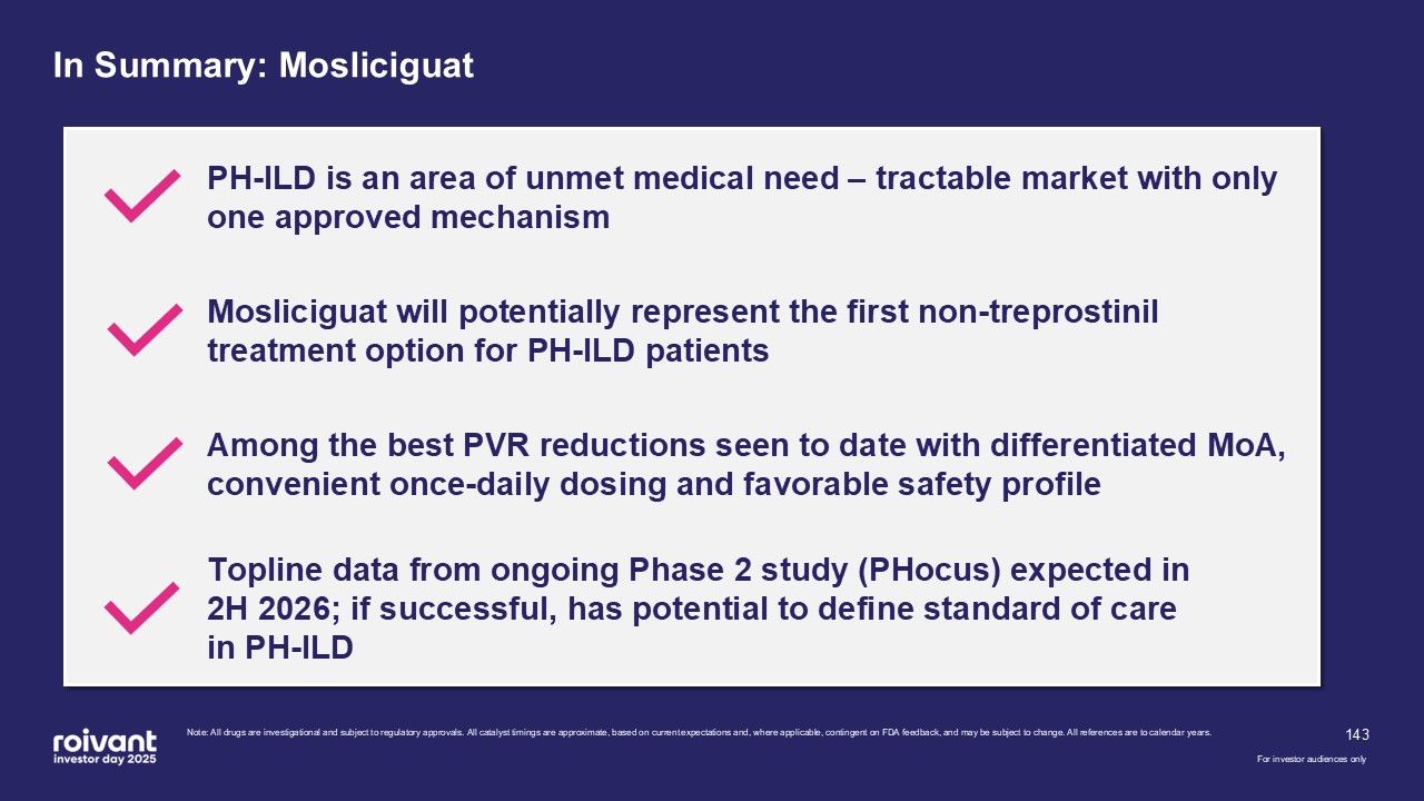 123  PH-ILD represents an area of intense unmet medical need with only one approved mechanism (two therapies) and an estimated 200,000 patients across the US and Europe  Topline data from ongoing Phase 2 study (PHocus) is expected in 2H 2026 – 120 patient study with the potential to define a new standard of care in PH-ILD  Mosliciguat with a differentiated mechanism of action – inhaled soluble guanylate cyclase (sGC) activator – is potentially the first non-treprostinil treatment option for PH-ILD patients  Parallels to PAH market with combination therapies present across the disease spectrum; however, PH-ILD expected to be larger commercial opportunity with competition limited to inhaled mechanisms  Among the best PVR reductions seen to date with convenient once-daily dosing and favorable safety profile across 170 healthy volunteers and PH patients – approved drugs have shown PVR reductions translate to clinical efficacy  Key Takeaways: Mosliciguat  For investor audiences only  PH-ILD: Pulmonary hypertension associated with interstitial lung disease  Note: All drugs are investigational and subject to regulatory approvals. All catalyst timings are approximate, based on current expectations and, where applicable, contingent on FDA feedback, and may be subject to change. All references are to calendar years.