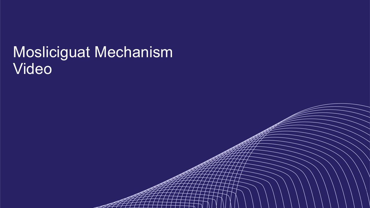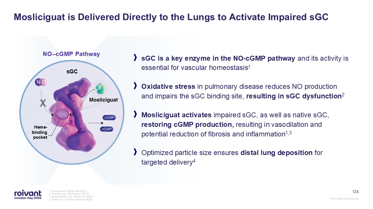 124  1. Sandner et al., Respir Med (2017)  2. Thoonen et al., Nat Commun (2015)  3. Becker-Pelster et al., Respir Res (2022)  4. Saleh et al., Clin Pharmacokinet (2025)  x  x  sGC is a key enzyme in the NO-cGMP pathway and its activity is essential for vascular homeostasis1  Oxidative stress in pulmonary disease reduces NO production and impairs the sGC binding site, resulting in sGC dysfunction2  Mosliciguat activates impaired sGC, as well as native sGC, restoring cGMP production, resulting in vasodilation and potential reduction of fibrosis and inflammation1,3  Optimized particle size ensures distal lung deposition for targeted delivery4  Mosliciguat is Delivered Directly to the Lungs to Activate Impaired sGC  NO–cGMP Pathway  Heme-binding pocket  sGC