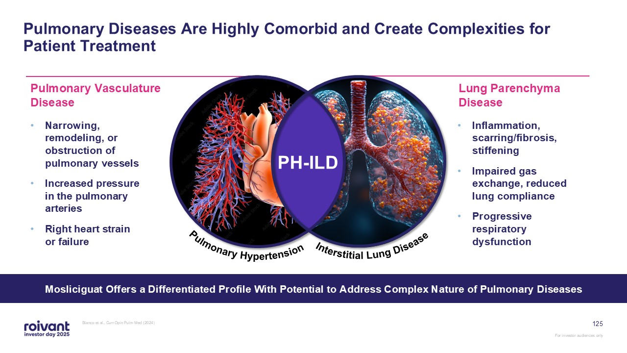 125  Pulmonary Diseases Are Highly Comorbid and Create Complexities for Patient Treatment  Blanco et al., Curr Opin Pulm Med (2024)  Mosliciguat Offers a Differentiated Profile With Potential to Address Complex Nature of Pulmonary Diseases  Narrowing, remodeling, or obstruction of pulmonary vessels  Increased pressure in the pulmonary arteries  Right heart strain or failure  Pulmonary Vasculature Disease  Inflammation, scarring/fibrosis, stiffening  Impaired gas exchange, reduced lung compliance  Progressive respiratory dysfunction  Lung Parenchyma Disease  PH-ILD  Pulmonary Hypertension  Interstitial Lung Disease